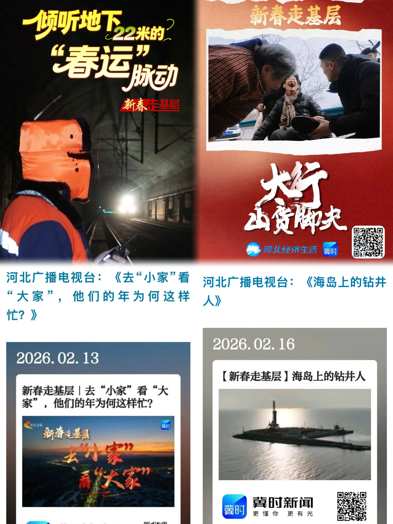 在2026年“新春走基层”活动中,全平台累计播发报道512篇次,总阅读量近6300万,点赞转发量超100万次,形成全媒体传播热潮。精品报道《太行山货脚夫》《倾听地下22米的“春运”脉动》被中宣部全网推送,《去“小家”看“大家”,他们的年为何这样忙?》《海岛上的钻井人》入选中国记协“我的代表作・新春走基层”特辑。