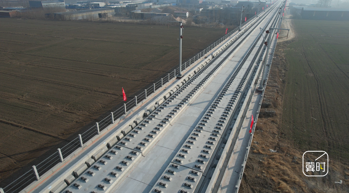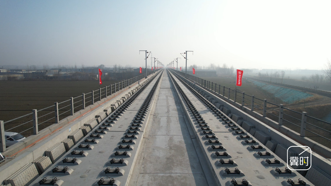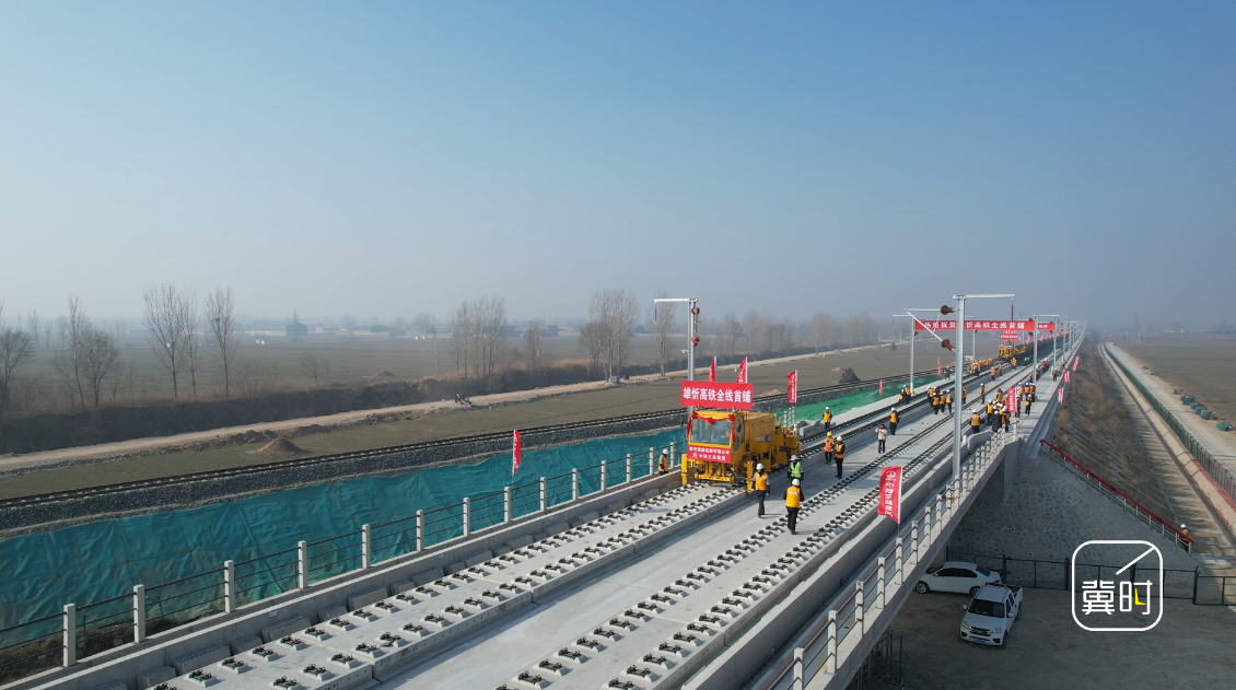 上午十点半,在保定市顺平县雄忻高铁跨京广铁路特大桥上,首对500米长钢轨平稳、精准地铺设在无砟道床上,标志着雄忻高铁正式进入铺轨施工阶段。