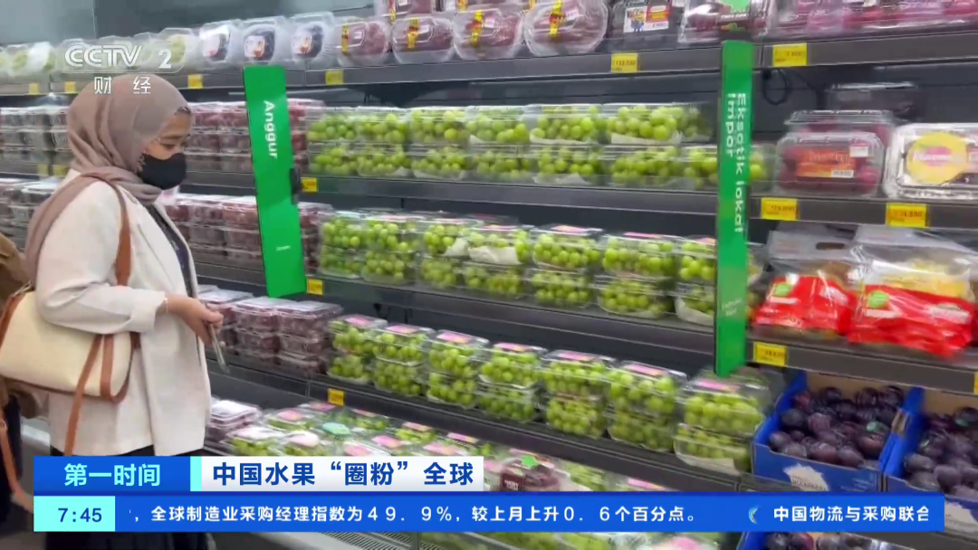总台记者 李琳 :在印度尼西亚雅加达的一家大型超市,在我身后是水果蔬菜区域。我了解到,像蓝莓、李子、阳光玫瑰葡萄还有苹果和柑橘都是来自中国的进口水果。根据印尼中央统计局的数据,中国已经连续多年成为印尼进口水果最大的来源国。