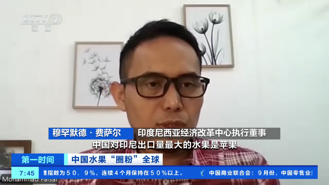 印度尼西亚经济改革中心执行董事 穆罕默德·费萨尔:中国对印尼出口量最大的水果是苹果,其次是葡萄,然后是柑橘。以苹果为例,如果我们看看中国水果在印尼市场的份额,就会发现它占印尼同类产品进口量的90%,葡萄约占69%,柑橘约占72%。这足以说明中国水果在印尼市场的出口渗透率有多高。