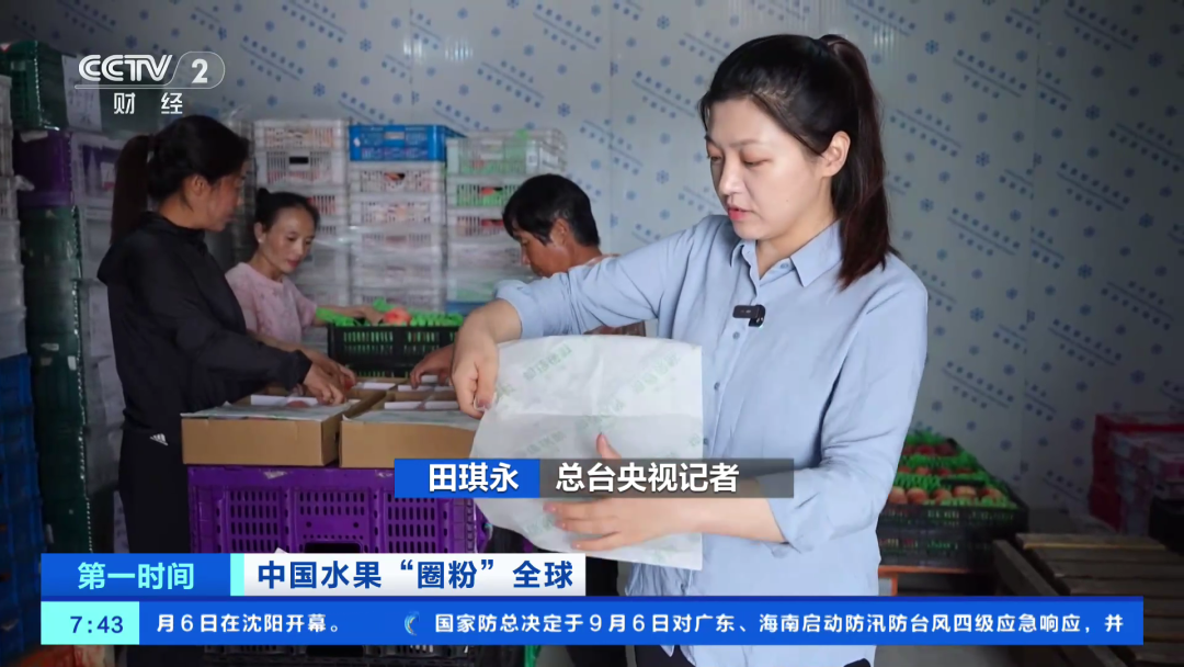 总台央视记者 田琪永:在大桃分拣中心,我们发现一张半透明的纸,这张纸是物理保鲜纸,通过它,可以让水果保鲜时长延长一倍以上。