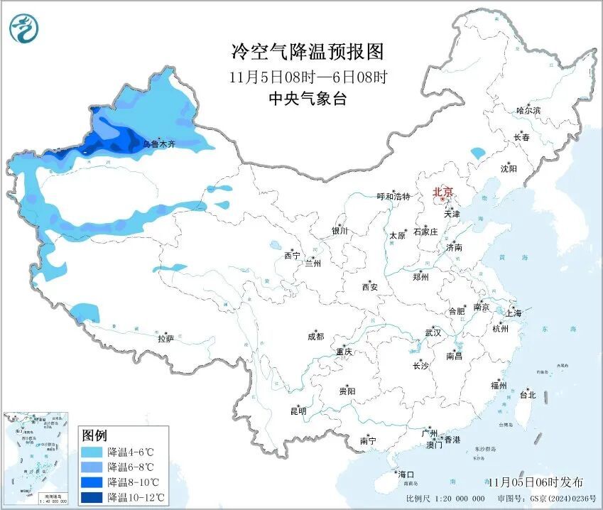 目前,新一股较强冷空气正在影响我国。今天(11月5日),新疆北部的雨雪将进入最强时段,部分地方将现大到暴雪甚至大暴雪。明后天,雨雪天气将继续向中东部铺展,西北地区东部、华北、东北、黄淮等地都会有降水出现,普遍以小雨雪天气为主。与此同时,冷空气将给北方地区带来明显降温,局地降幅超10℃。