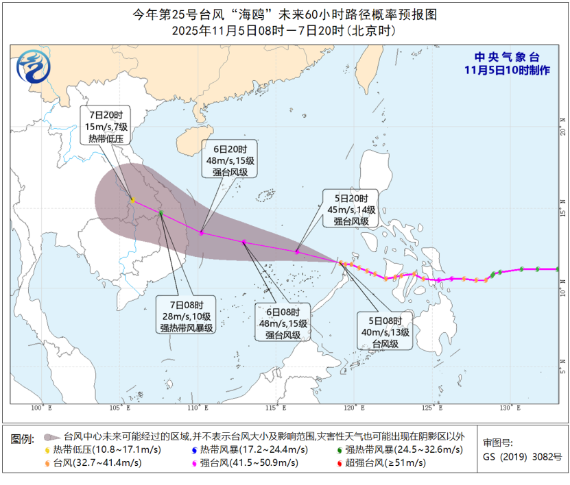 预计5日14时至6日14时,受“海鸥”和南下冷空气的共同影响,台湾海峡、台湾以东洋面、巴士海峡、南海大部及东沙群岛、南沙群岛、中沙群岛、西沙群岛、黄岩岛将有6~8级大风、阵风9~10级,其中南海中部和南部的部分海域、南沙群岛北部将有9~11级大风、阵风12~13级,“海鸥”中心经过的附近海域风力有12~14级、阵风15~16级。