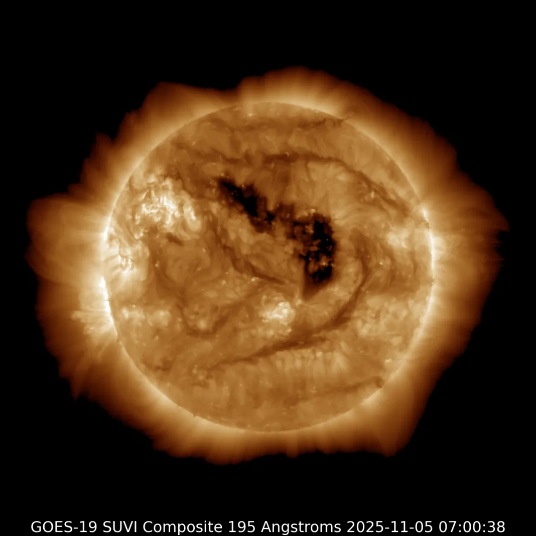 △195埃波段下看到的太阳,其中深棕色区域就是冕洞