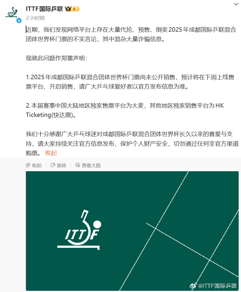 国际乒联(ITTF)官方微博11月8日消息,近期,我们发现网络平台上存在大量代抢、预售、倒卖2025年成都国际乒联混合团体世界杯门票的不实言论,其中混杂大量诈骗信息。