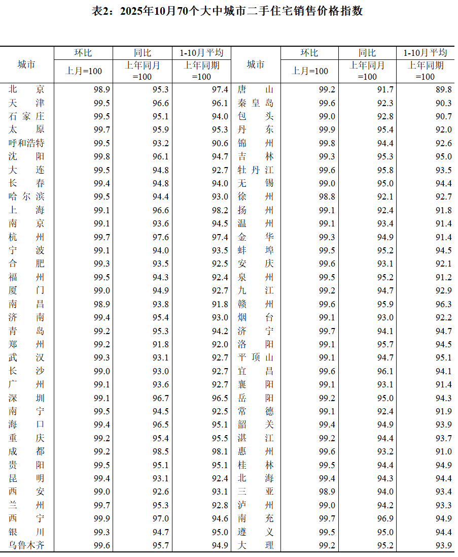 10月份,一线城市二手住宅销售价格环比下降0.9%,降幅比上月收窄0.1个百分点。其中,北京、上海、广州和深圳分别下降1.1%、0.9%、0.9%和0.9%。二线城市二手住宅销售价格环比下降0.6%,降幅收窄0.1个百分点。三线城市二手住宅销售价格环比下降0.7%,降幅扩大0.1个百分点。