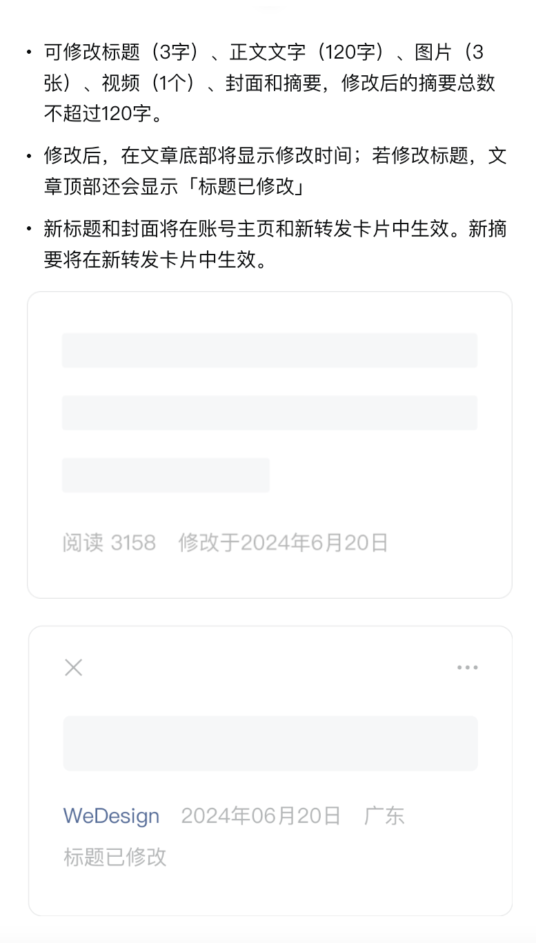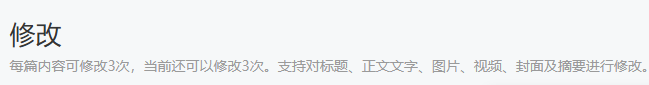 可修改标题(3字)、正文文字(120字)、图片(3张)、视频(1个)、封面和摘要,修改后的摘要总数不超过120字。