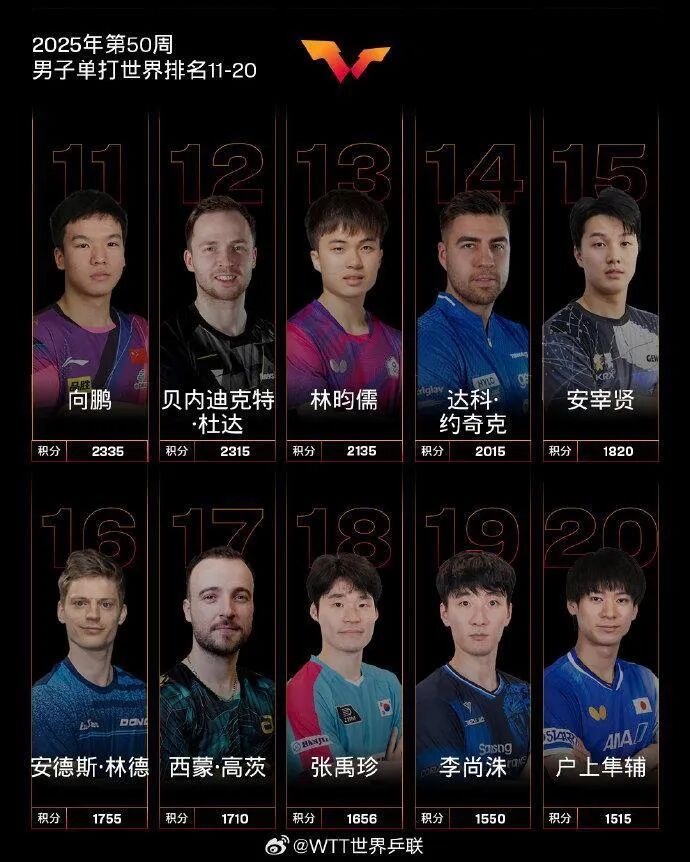 其他中国队球员,向鹏排名第11,陈垣宇排名第24,周启豪排名第41,陈俊菘排名第45,黄友政排名第49。