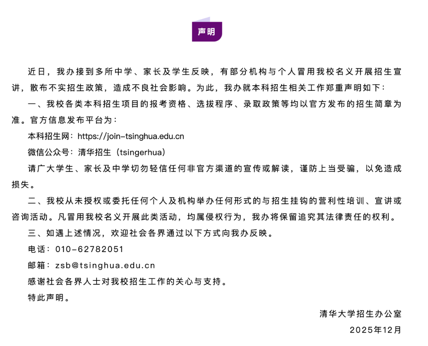 声明称,近日,清华大学招生办接到多所中学、家长及学生反映,有部分机构与个人冒用清华大学名义开展招生宣讲,散布不实招生政策,造成不良社会影响。