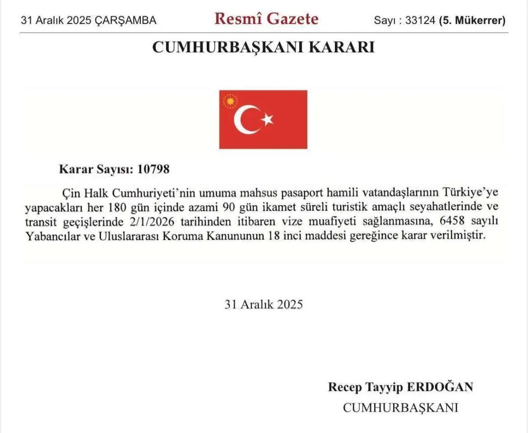 据新华社报道,土耳其政府2025年12月31日宣布,自2026年1月2日起,对持普通护照的中华人民共和国公民实施免签入境政策。