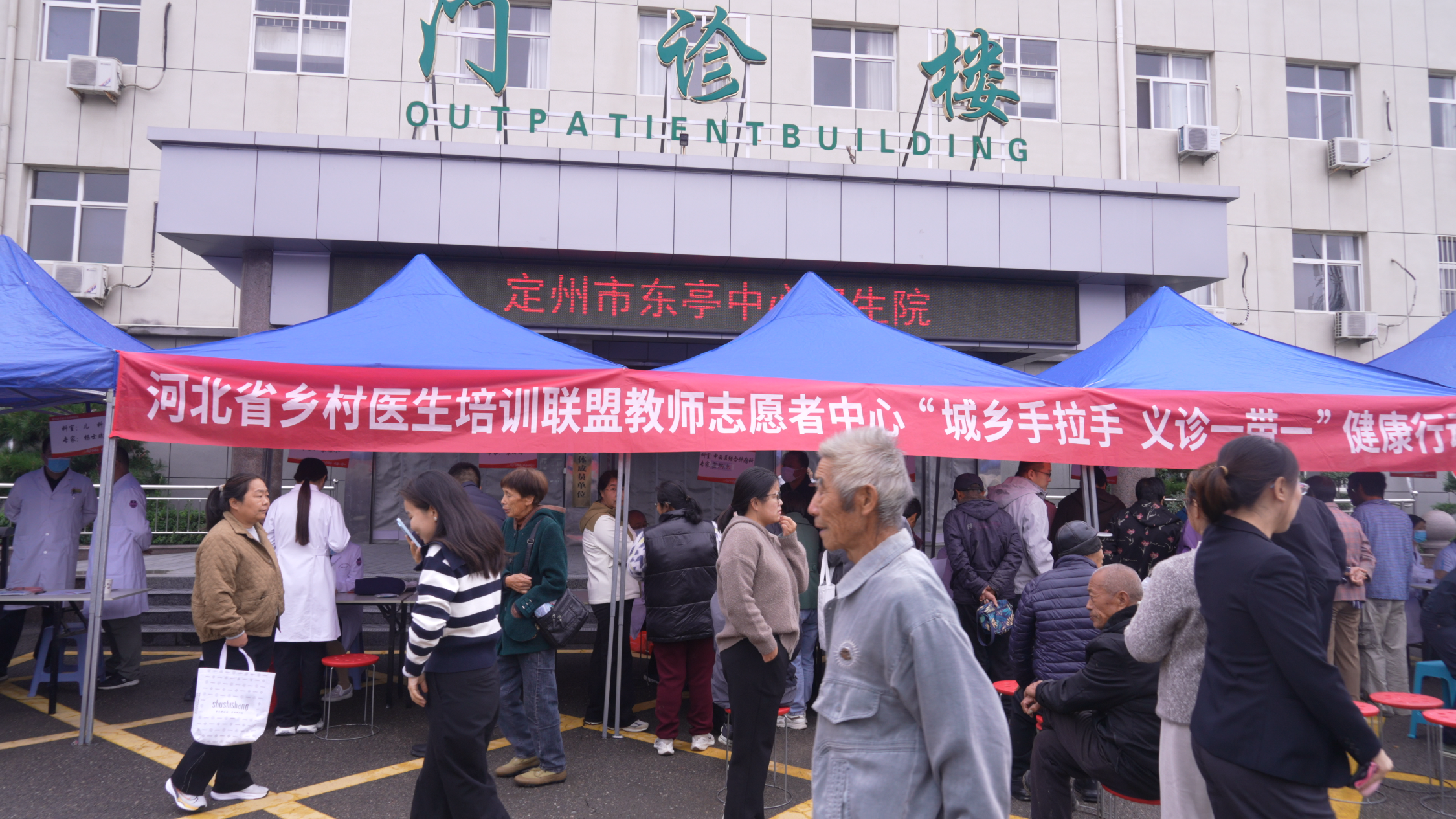 仪式后,来自呼吸、内分泌、心内、神经内科、中医、消化等 18 个科室的 35 名教师志愿者带领 35 名乡村医生,分赴定州市东亭镇中心卫生院及翟城村开展义诊,现场为村民提供免费诊疗和健康咨询、用药指导,开展中医适宜技术和中医药文化体验活动,并通过病例分析、带教查房等方式指导乡村医生掌握常见病的诊断与处理方法。学生志愿者在科普场地宣讲知识展板、发放健康宣传资料。
