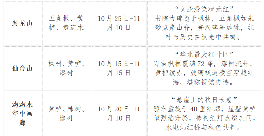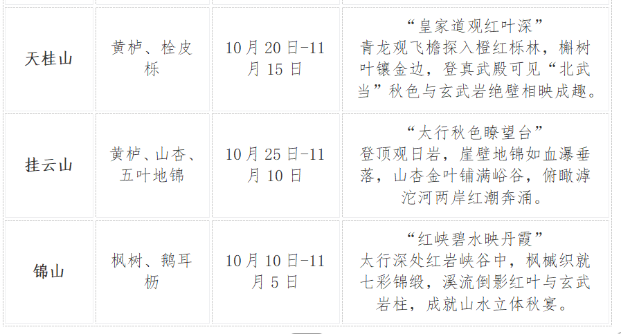 由于今年夏季气温偏高、日照充足,植被长势茂盛,叶片质量完整舒展,为秋色提供了良好基础。根据物候观测情况,石家庄西部山区高海拔区域如驼梁、五岳寨等地,预计树叶在10月上旬进入变色始期,而西部浅山区和平原区域则于10月中旬开始变色。