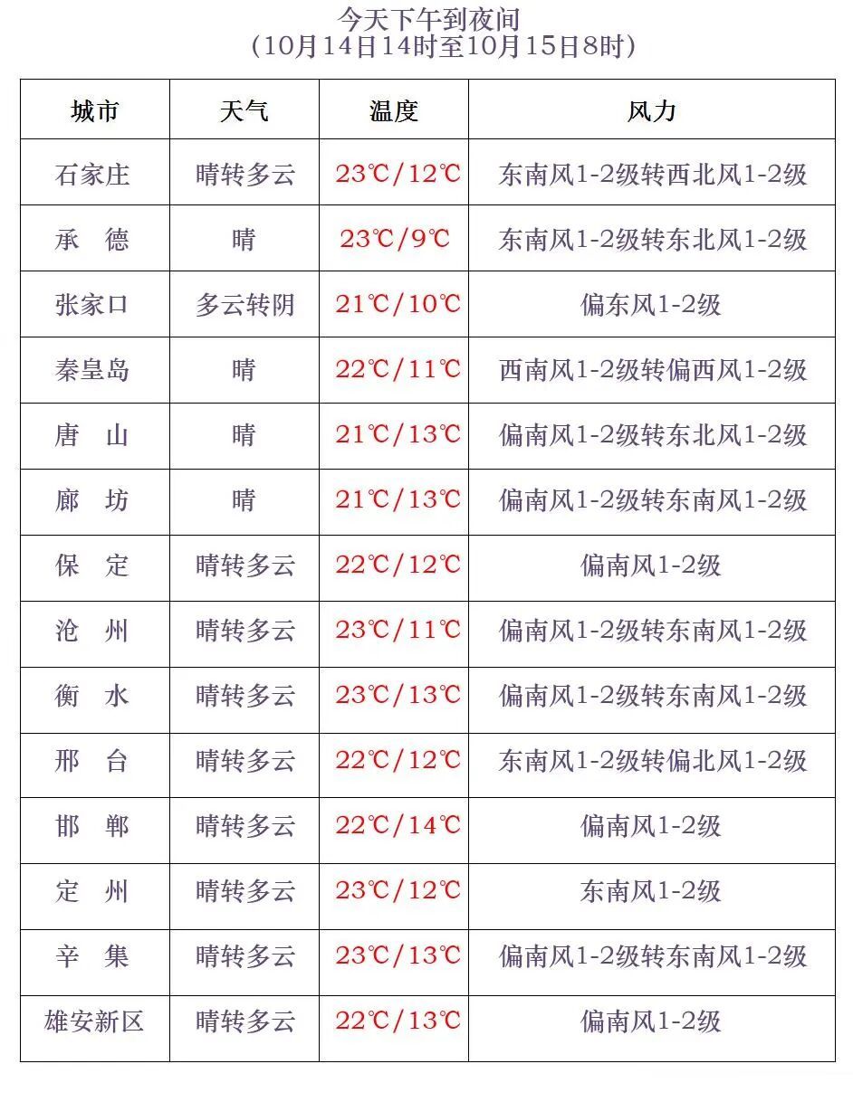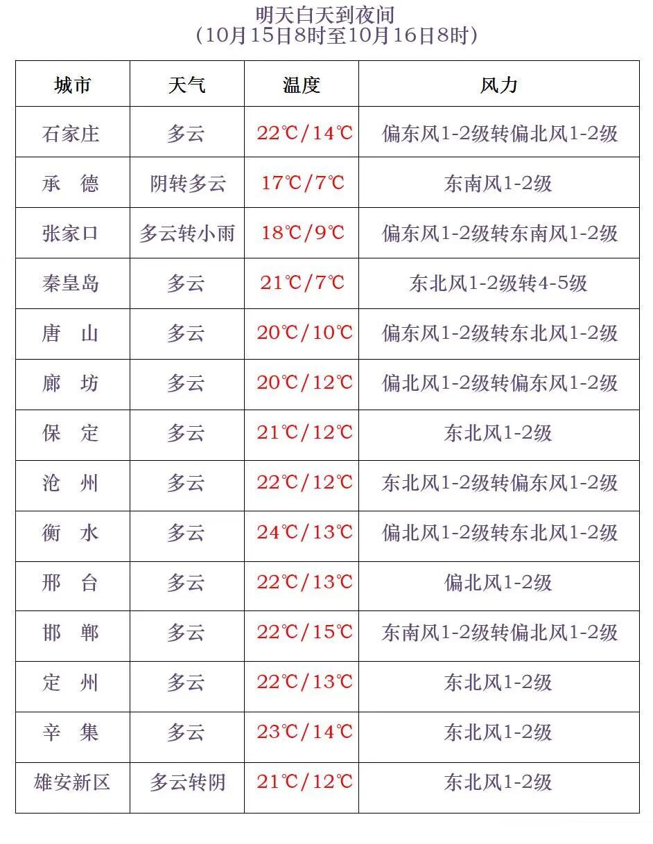 明天夜间到16日,张家口、承德中西部、保定、雄安新区、石家庄、衡水西部、邢台西部、邯郸西部阴有小雨,局地有中雨,其中坝上地区有雨夹雪;其他地区多云。
