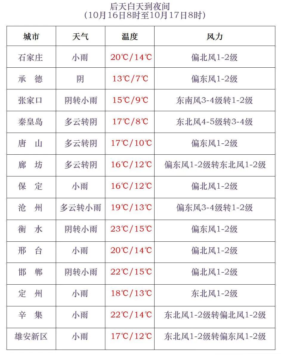 16日夜间到17日,中南部地区阴有小雨,局地有中雨,其他地区阴有小雨或零星小雨转多云,其中坝上地区有雨夹雪。