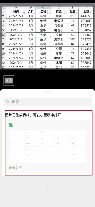 接下来,便是见证奇迹的时刻。手机屏幕先是出现扫描的动画效果,之后一分为二:上半部分为原图,下半部分为扫描成excel文件的小程序链接,点击即可进入。