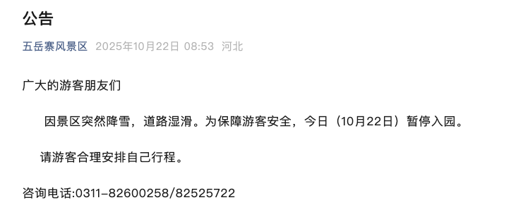 石家庄五岳寨风景区发布公告显示: