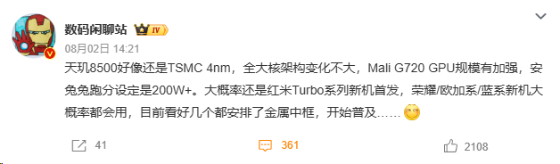 处理器方面,Turbo 5 大概率会首发天玑 8500 芯片,用的是台积电 4nm 工艺,安兔兔跑分预计能突破 200W,应对日常使用和主流游戏肯定没问题;电池容量直接给到 7000~8500mAh,搭配 90W 有线快充,续航焦虑基本能根治;此外,像超声波指纹、满级防水、NFC 这些实用配置也没落下,该有的都给配齐了。
