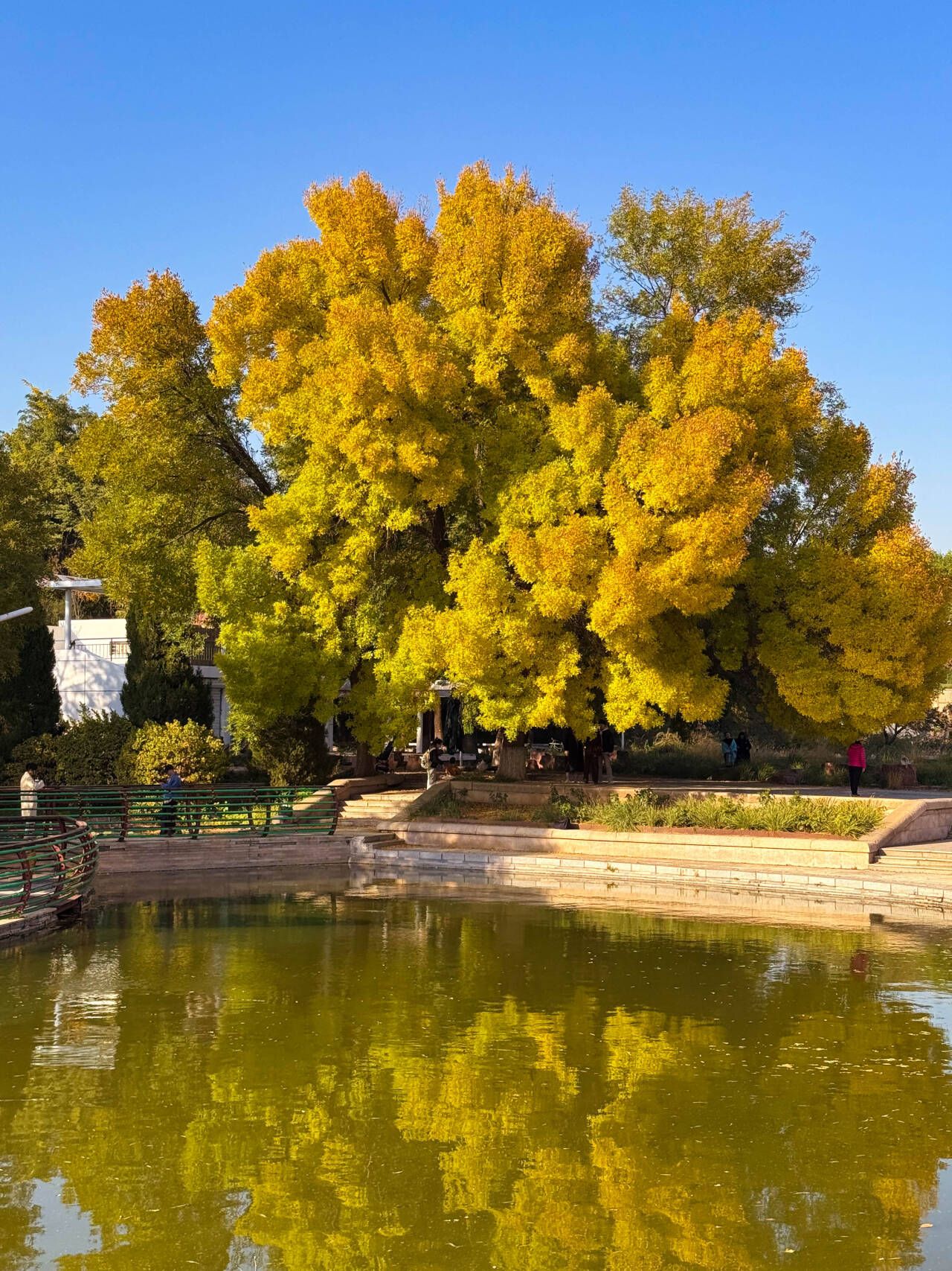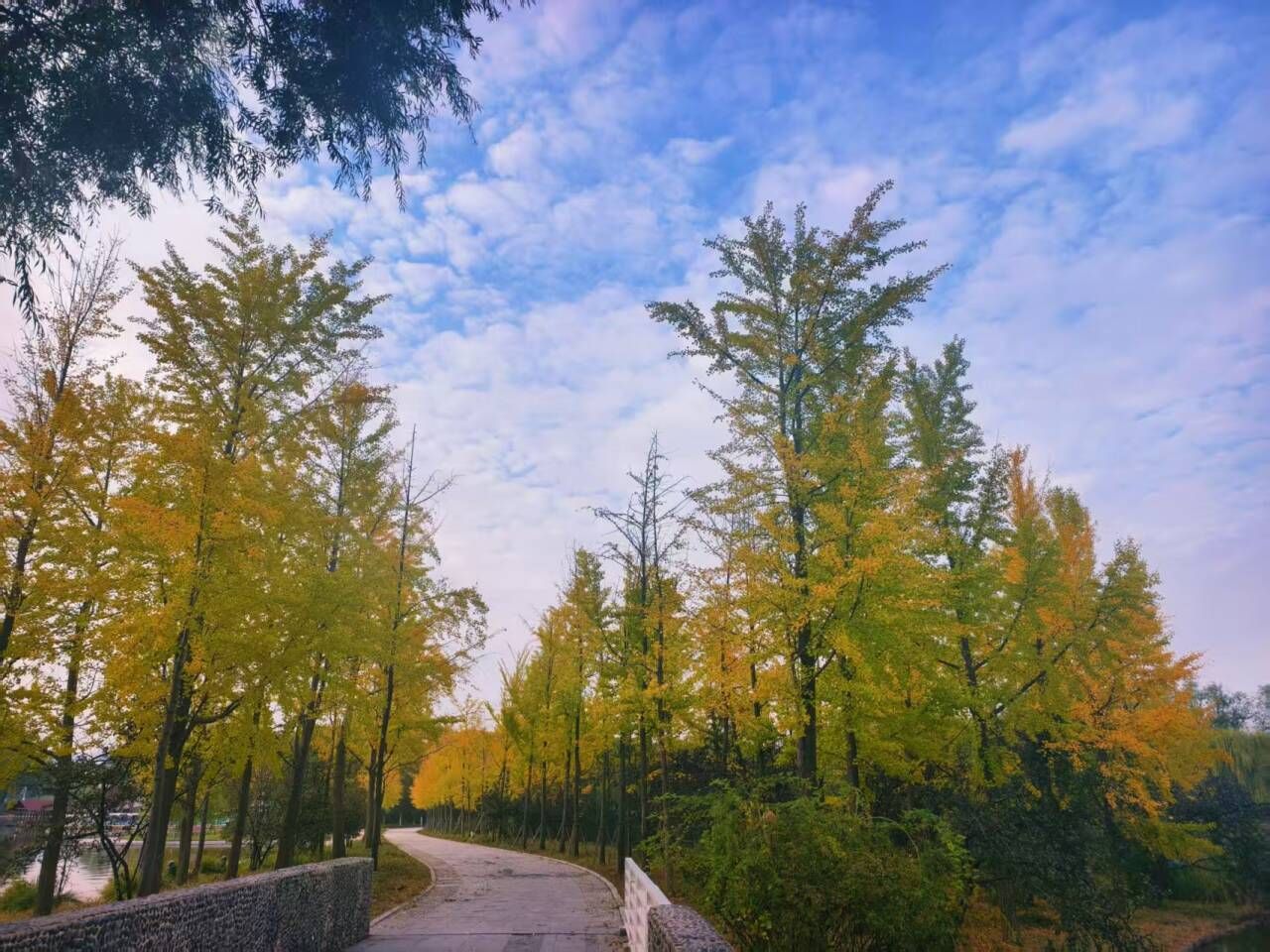 其中最为壮观的当属银杏。大约有 6000 余棵,主要分布在花钟路、银杏堤、大榕树景观附近及园区北侧的银杏林等区域。这些银杏树高大挺拔,此时正渐渐褪去翠绿,换上金黄的盛装,扇形叶片在阳光下折射出温暖的光泽,风过处满树“金蝶”蹁跹。园内水中莲花景区北侧,作为“老网红”的几棵白蜡,经历了风雨的洗礼,它们的树冠已经交织在一起,高度大约在 10 余米,远观上去宛若形成一体。白蜡的叶片呈椭圆形,边缘有细小的锯齿。微风吹过,满树金黄轻轻摇曳,与湖中的倒影相映成趣。
