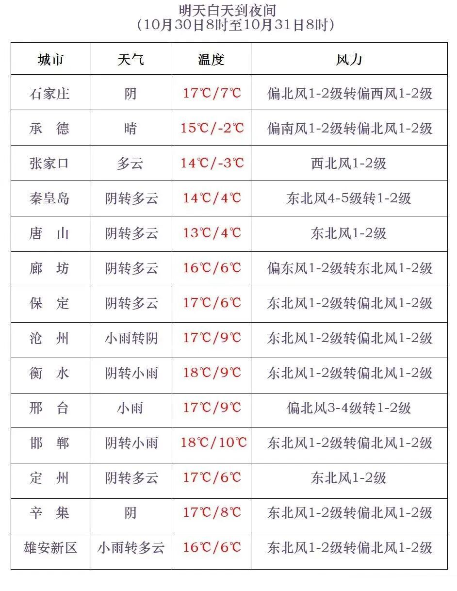 明天夜间到31日,张家口北部、承德北部阴有零星小雨或零星雨夹雪转晴,石家庄、沧州以南地区阴有小雨或零星小雨转晴,其他地区晴间多云。