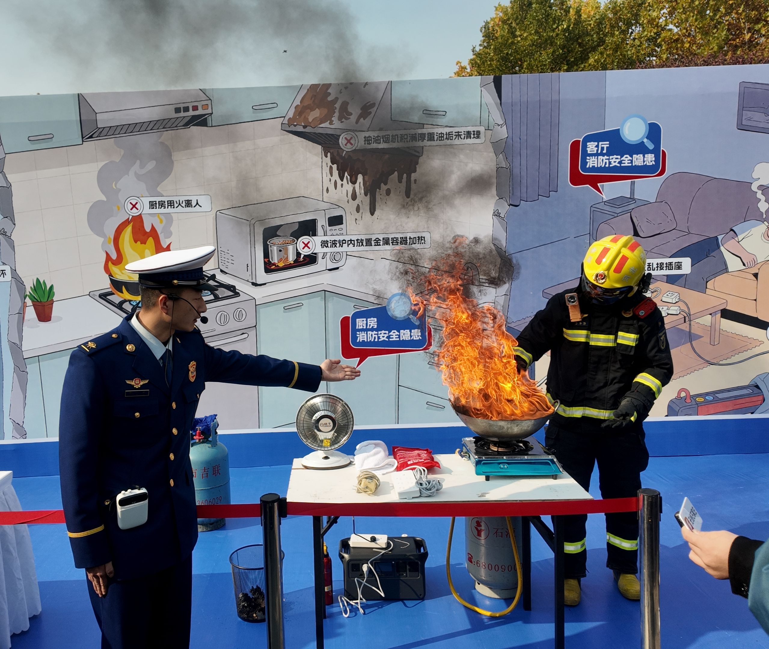 针对“电动自行车‘飞线’充电有多危险?”“厨房油锅起火该用哪种方式灭火?”等市民高频咨询的问题,现场精准还原违规操作引发的火灾过程 —— 从电动自行车锂电池过载冒烟、迸出火星,短短数十秒内便出现燃爆迹象并伴随有毒烟气扩散;到厨房油锅遇明火爆燃、油星飞溅;再到电气焊违规作业引燃彩钢板夹层,每一个场景都让在场群众屏住呼吸,直观感受到“小隐患”酿成“大事故”的严峻风险。
