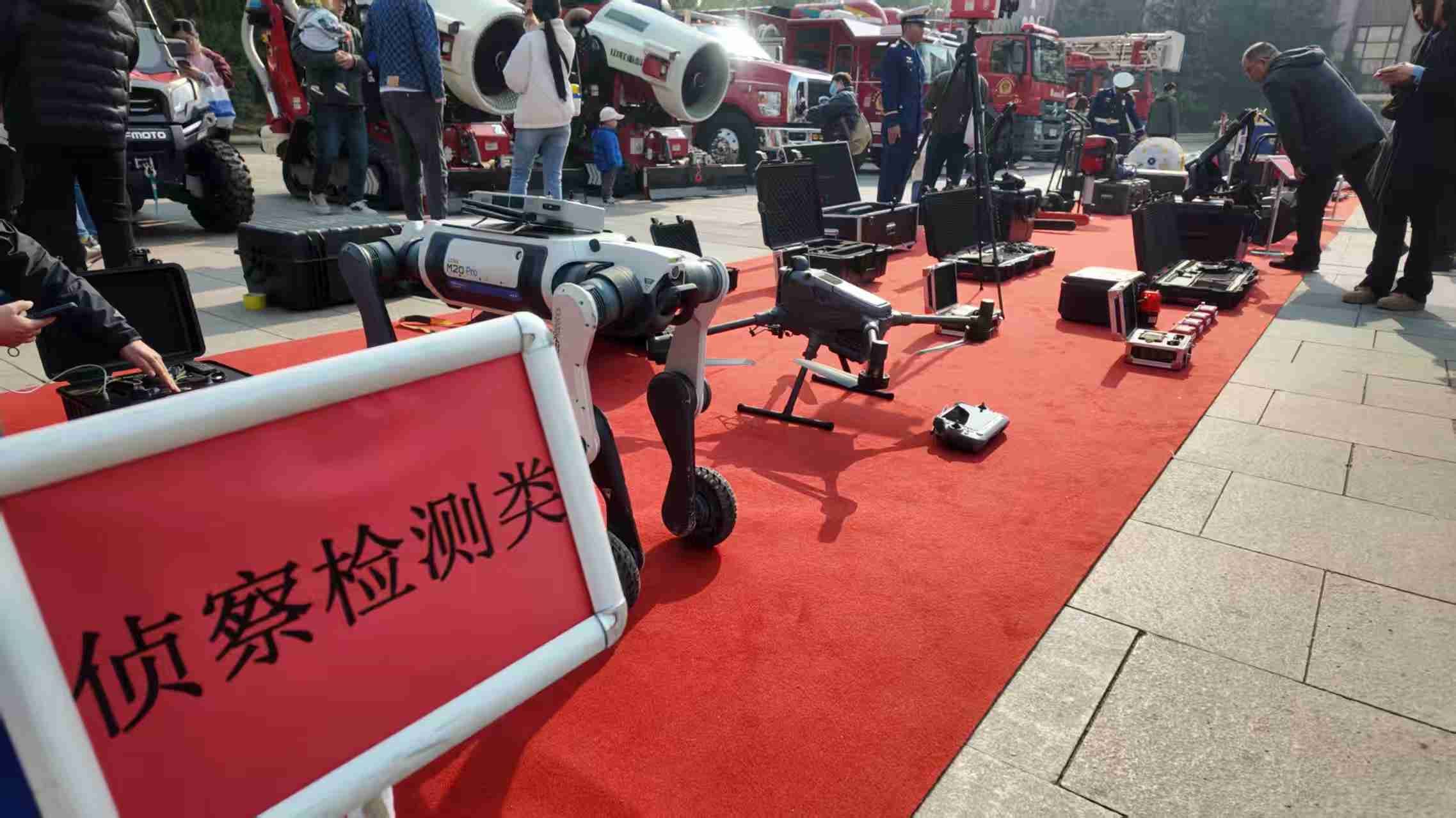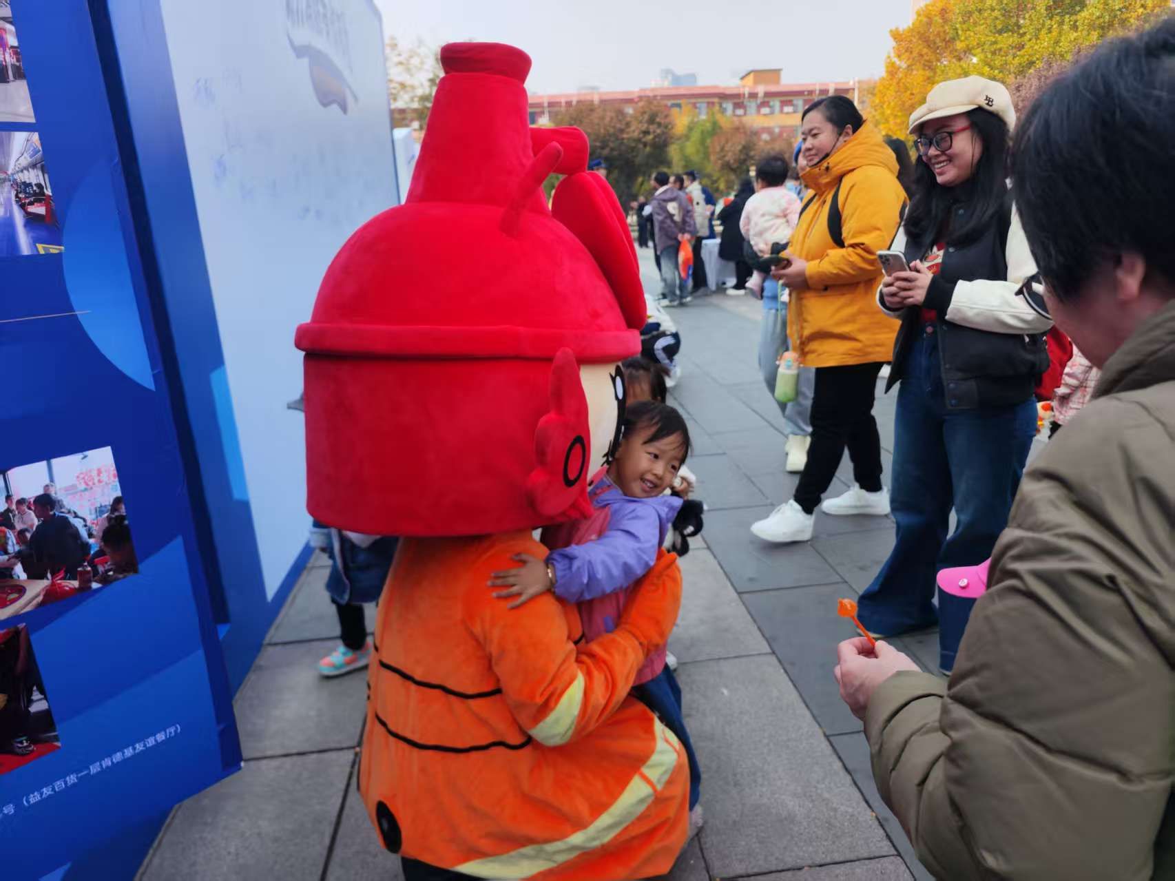 火灾逃生帐篷体验区前始终排着长队,帐篷内模拟真实火灾浓烟环境,能见度不足1 米,仅靠墙壁指示灯指引方向。“弯腰、捂鼻、扶墙走,别慌!”在消防救援人员的耐心引导下,群众依次进入帐篷体验逃生,从最初的紧张慌乱,到逐渐掌握要领顺利“脱险”。搜救犬科目展示区同样是现场的“人气焦点”。训导员带着搜救犬进行了跨越障碍等实战科目演示,搜救犬们神情专注,动作精准高效,充分展现了它们在灾害现场搜寻被困人员的硬核实力。消防车辆装备展示区同样人气高涨,井下狭小空间救援展示、综合破拆技术展示、登高平台消防车整齐停放,破拆工具组、空气呼吸器、热成像仪等高精端消防装备逐一亮相。现场工作人员不仅详细讲解装备功能,还邀请群众亲手触摸、尝试操作,小朋友们围着装备和车辆好奇体验,展示区现场变成了生动的“消防课堂”。现场还特别设计贯穿全程的消防平安“福”答题环节,市民通过参与答题活动兑换带有消防元素的水杯、购物袋等定制的文创礼品。
