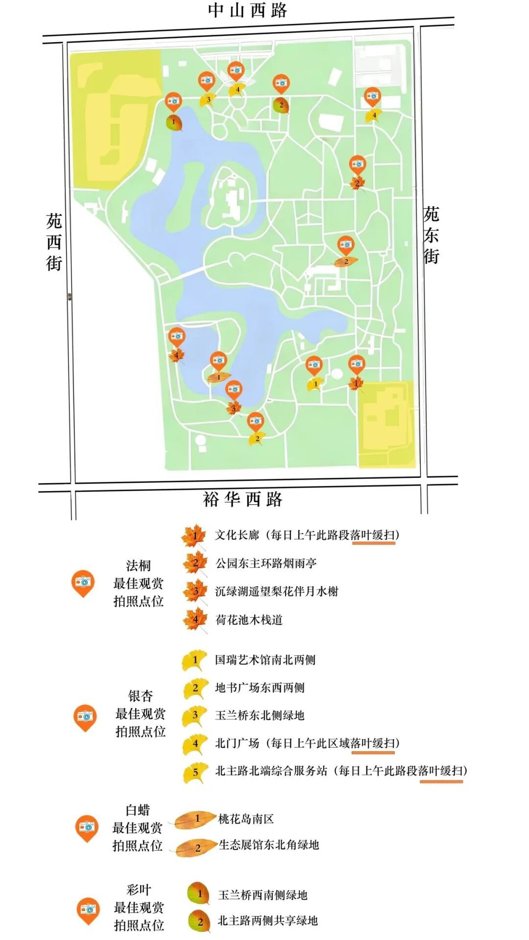 为方便市民赏叶拍照,裕西公园特别推出了“游园攻略+地图”,标注了多个最佳观赏点位,包括文化长廊、烟雨亭、梨花伴月水榭、国瑞艺术馆周边、北门广场等。公园还根据市民需求,额外划定部分道路和广场,实行“每日缓扫”,让赏景与健身互不干扰。