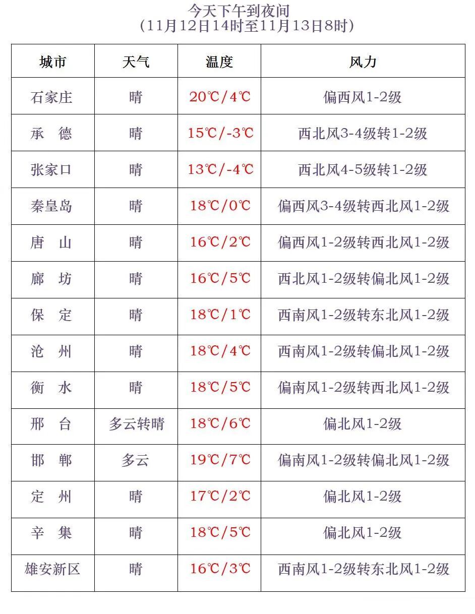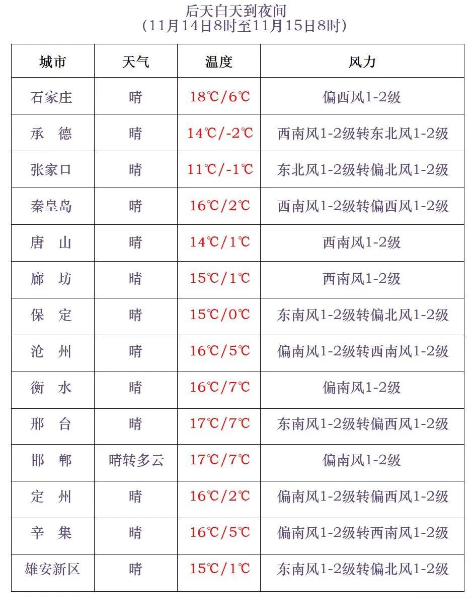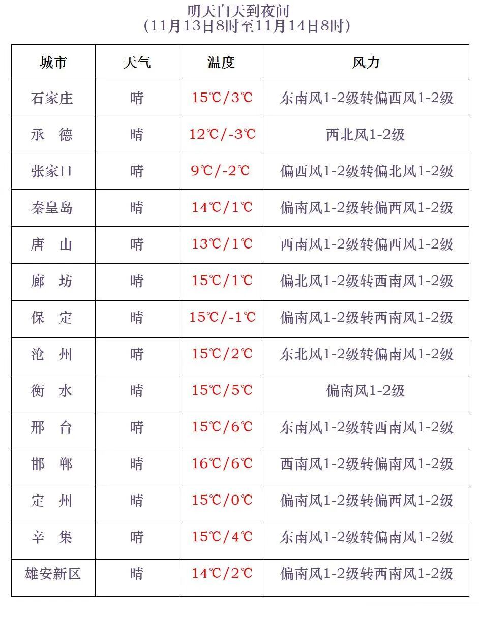 明天白天,全省晴间多云。最高气温,张家口、承德、秦皇岛北部、保定西北部2~13℃,其他地区14~19℃。