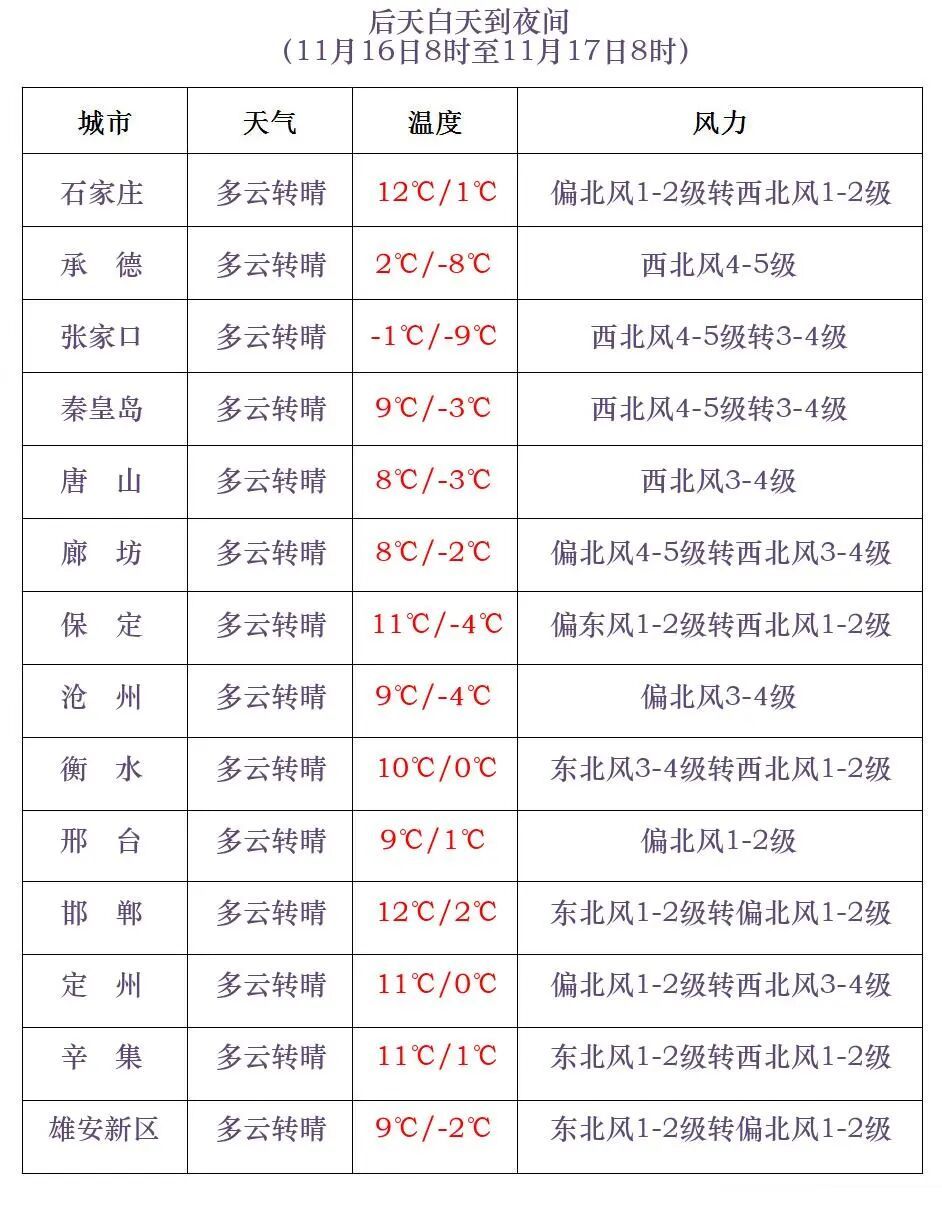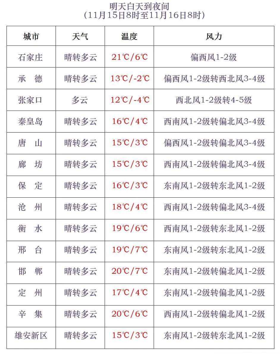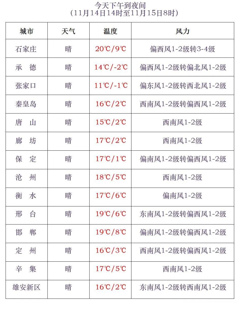 河北省气象台2025年11月14日11时发布天气预报: