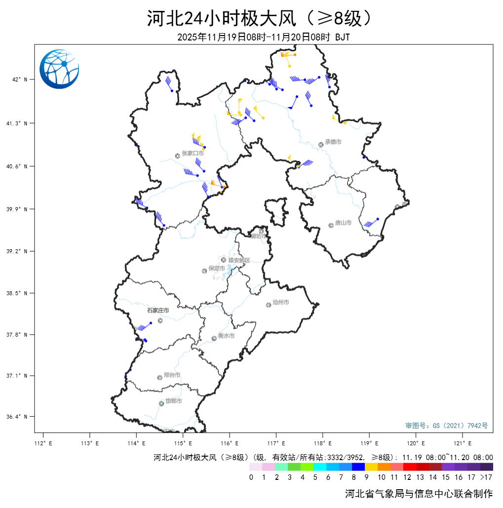 河北省气象台2025年11月20日6时20分继续发布大风蓝色预警信号:
