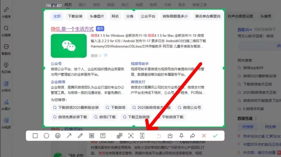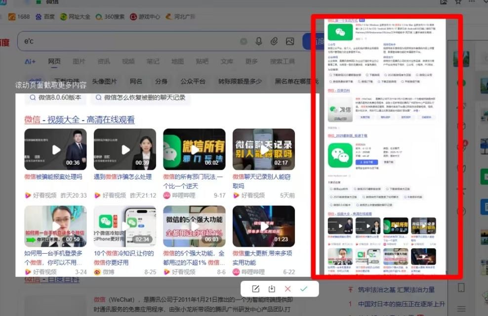 在想要截图的网页上框选范围,注意,只需框选其中一部分即可。然后在底部工具栏中,点击滚动截图按钮。