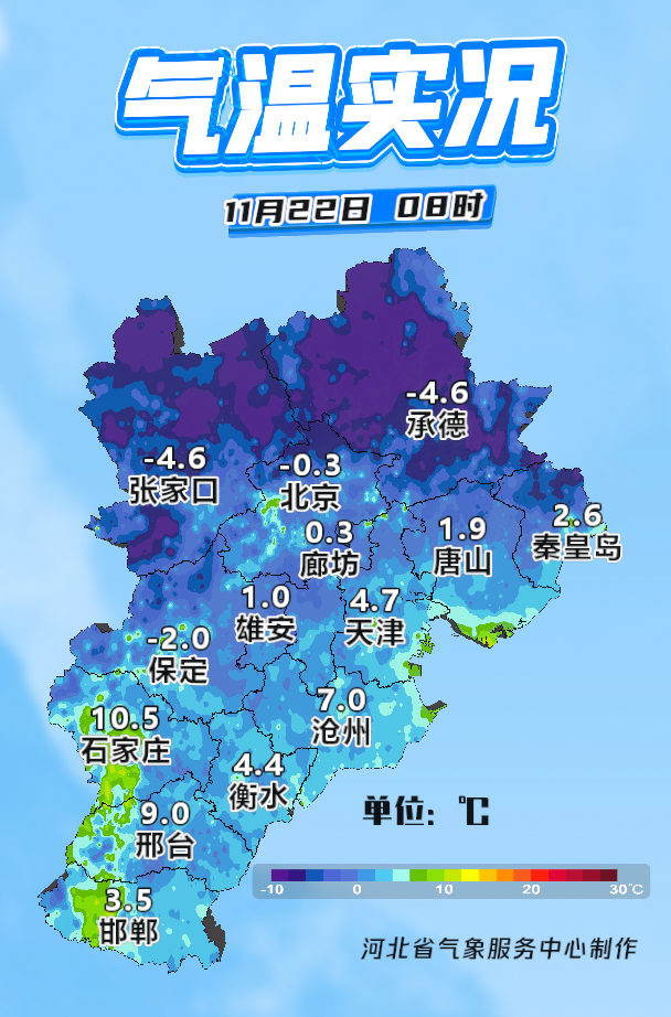 据河北省142个国家级气象站数据统计,21日8时至22日8时,全省无明显降水。今日8时,我省气温多在-11~11℃上下,本时刻全省气温最高值出现在邯郸武安,为11.8℃,最低值出现在张家口沽源,为-11.2℃。和昨天同时刻相比,张家口西北部和我省南部地区气温上升了2~7℃左右,除此之外省内其他地区气温则下降了2~9℃不等。