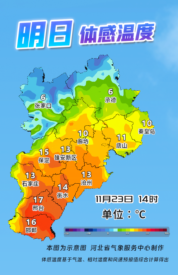 明天夜间到24日,保定、廊坊及以北地区多云转阴,其中张家口北部、承德东部、唐山南部、秦皇岛有小雪或雨夹雪,其他地区多云。