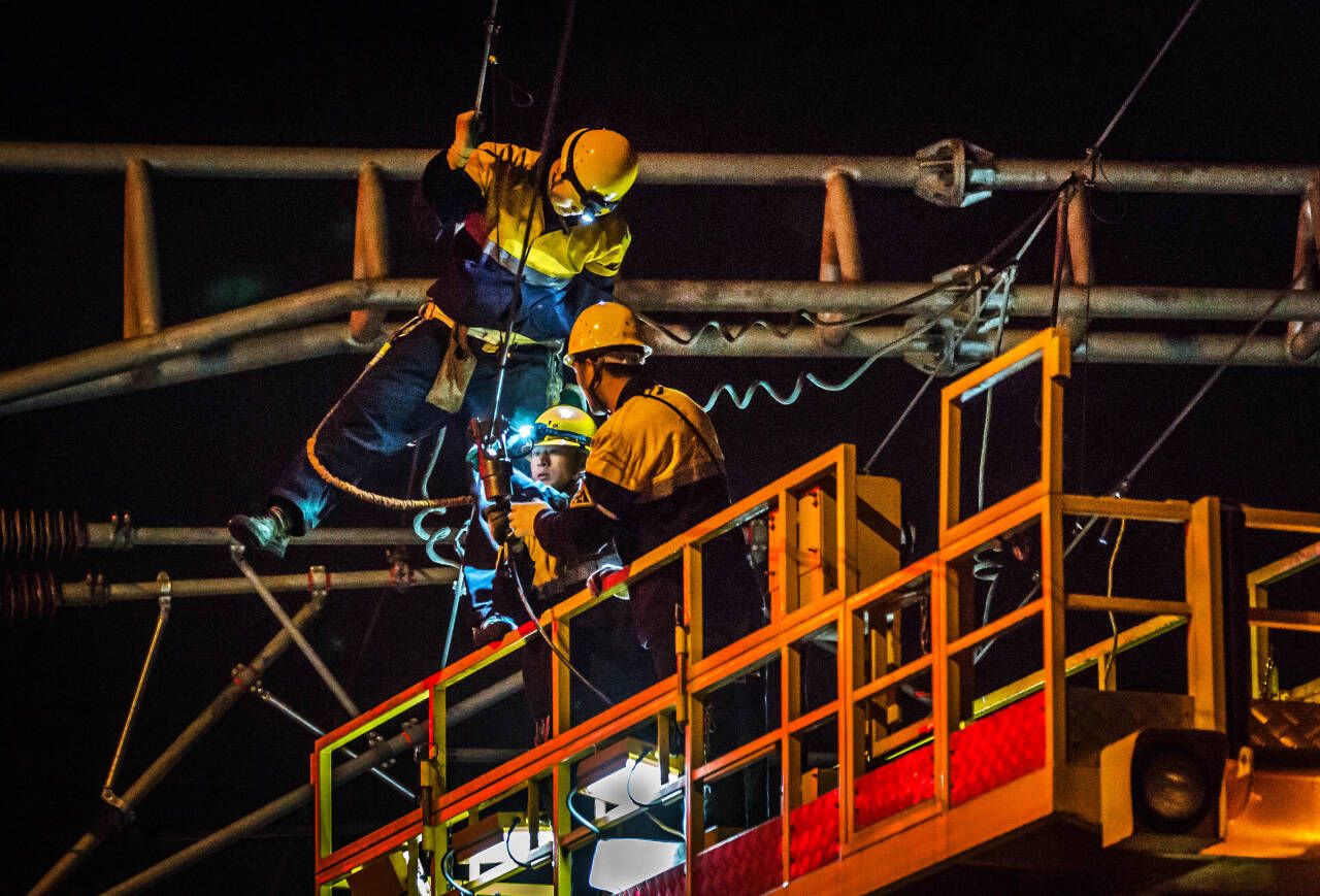 在作业现场,空旷的铁道线上寒风裹挟着山涧潮气呼啸而过,给高空作业增添诸多难度。身系安全带与保护绳的铁路工人悬于接触网间,要在每次近3小时的“天窗”时段内,高效处置设备缺陷,彻底消除各类安全隐患,保障列车供电安全稳定。 由于需要在高空完成设备检查、零部件更换等作业,再加上梯车、测量仪等工具,这些作业人员平均每人要携带3.5公斤重的工具装备,他们每一次移位不仅要克服高空气流的干扰,抵抗严寒的考验,还必须时刻保持如履薄冰的高度工作状态,确认保护绳挂点的绝对牢固、安全带的重新紧束,方才着手进行下一步操作。