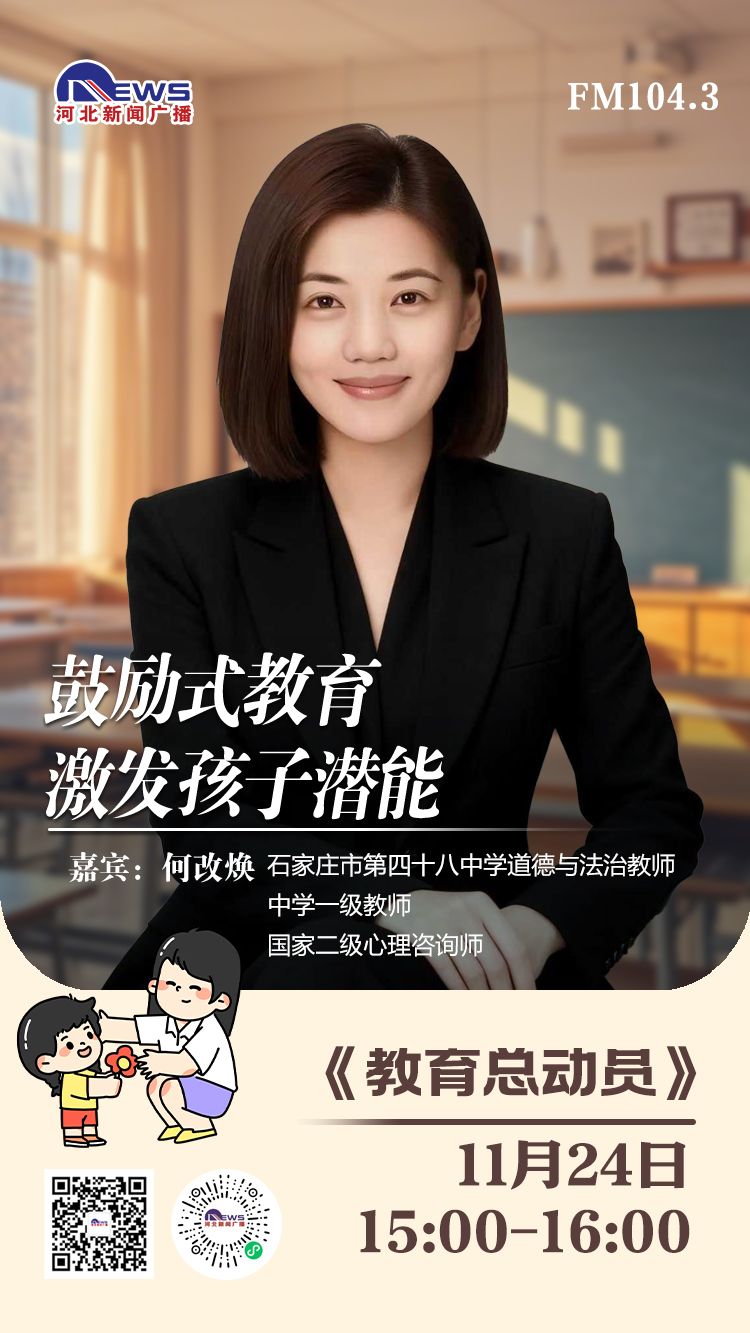 在孩子的成长旅程中,教育方式的选择犹如为他们指引方向的明灯,鼓励式教育,正是那能照亮孩子前行道路、激发他们无限潜能的温暖光芒。今天我们邀请到石家庄市第四十八中学道德与法治教师、中学一级教师、国家二级心理咨询师何改焕老师分享鼓励式教育的奥秘。