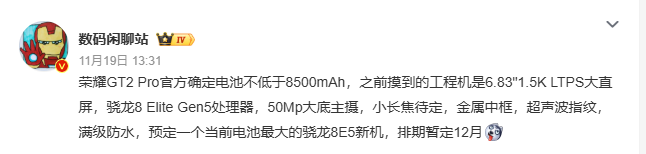荣耀GT2系列预计本月发布,有荣耀GT2和荣耀GT2 Pro两款新机,将分别搭载骁龙8 Elite和骁龙8 Elite Gen5,均配备100W有线充电和大电池。爆料显示,荣耀GT2 Pro电池不低于8500mAh,可能是今年电池最大的骁龙8EG5新机。