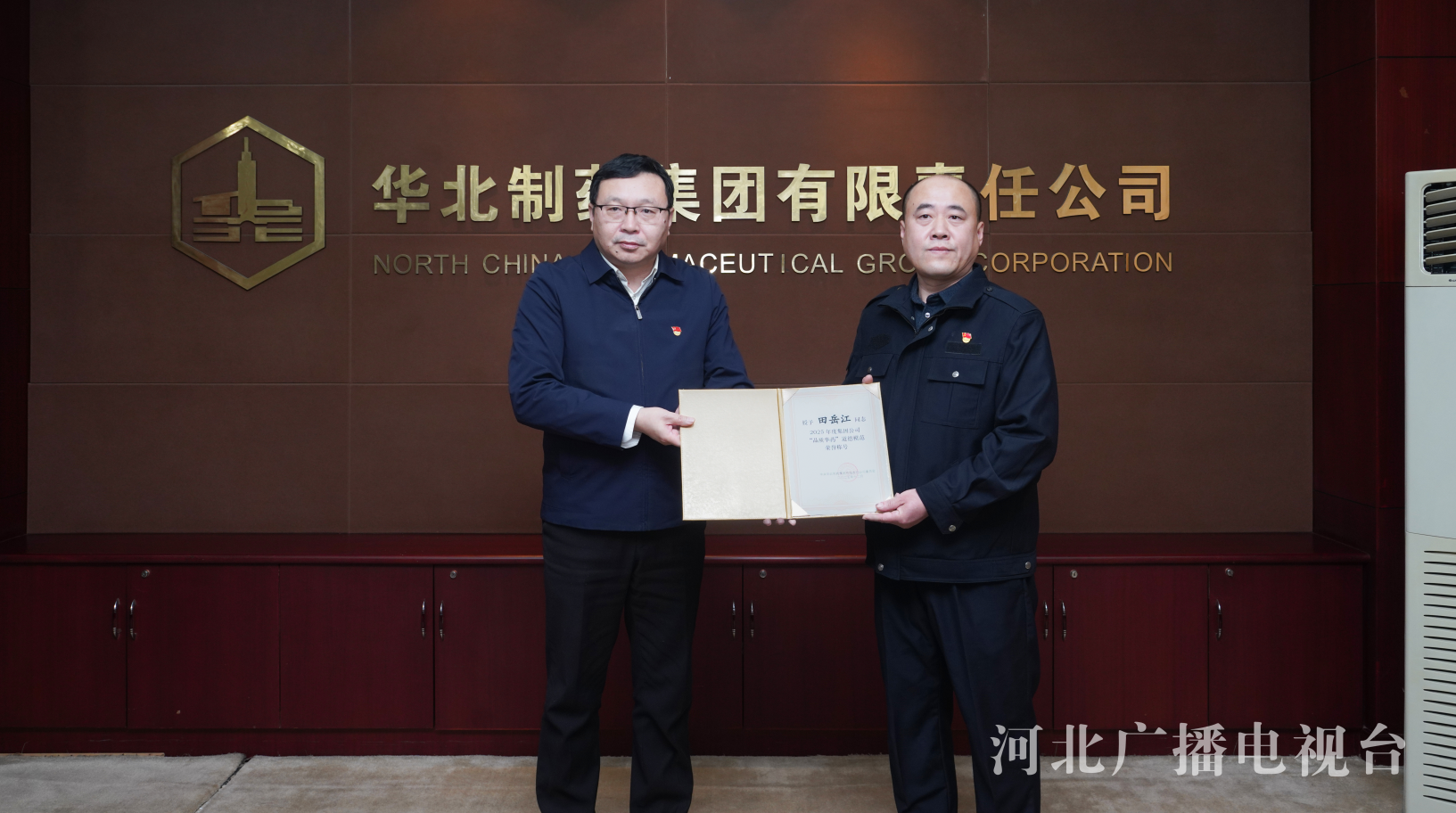 田岳江(右一)被华北制药集团党委授予其2025年度“品质华药道德模范”荣誉称号