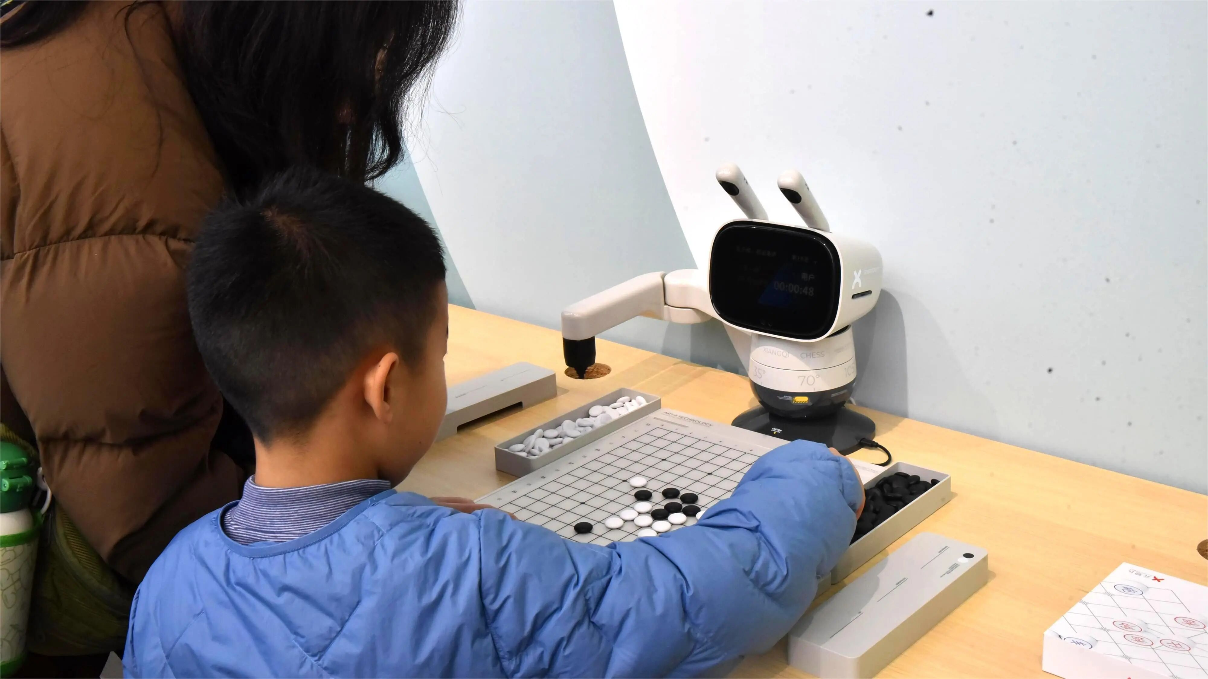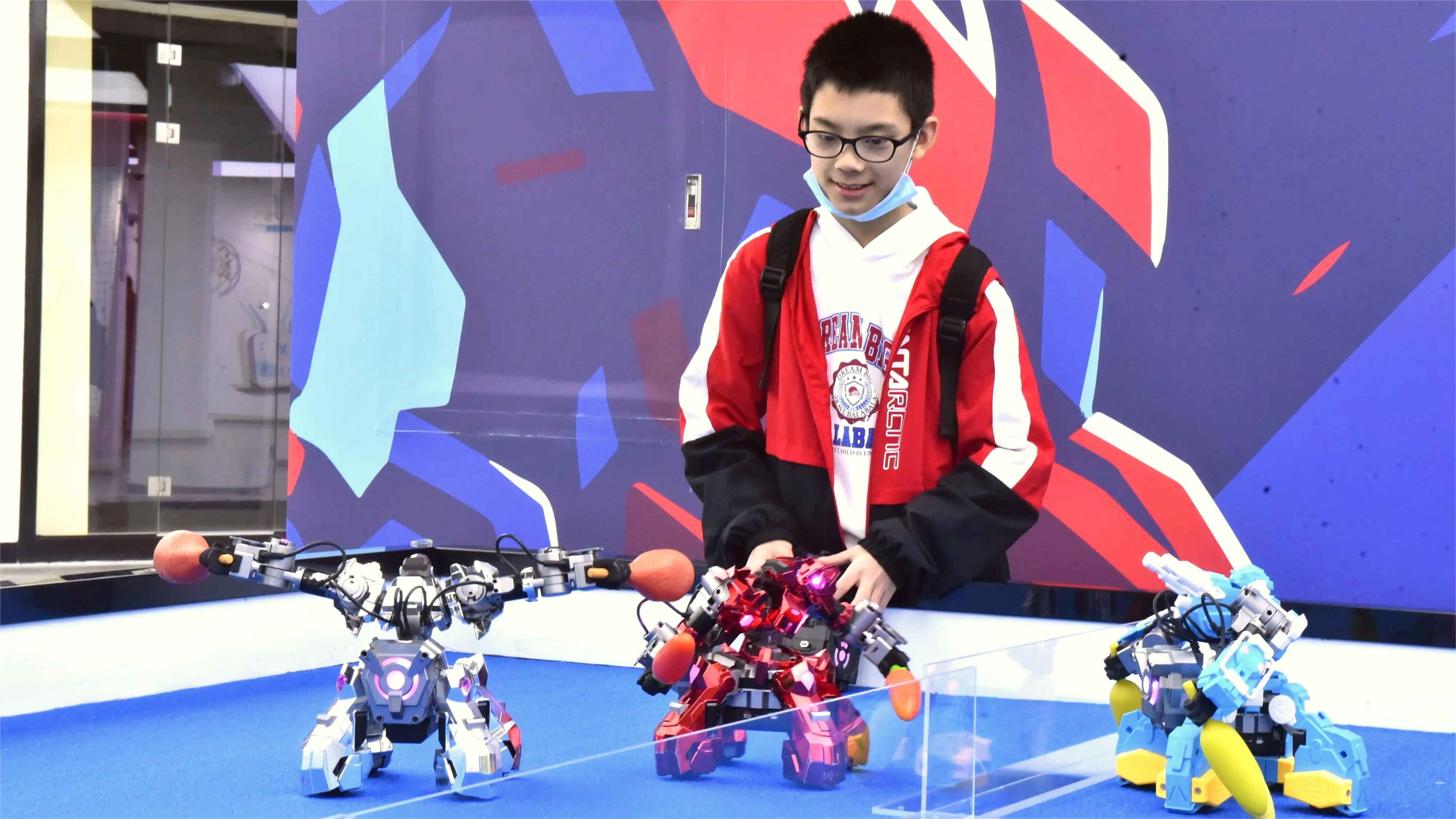 各个互动体验区前都排起了长队。在工作人员的指导下,孩子们亲手操控无人机起飞、盘旋、转向,感受空中视角的新奇;围棋人机对弈项目,小棋手们正专注地与AI棋手博弈,时而皱眉思考,时而落子果断,在黑白棋子的交锋中体会人工智能的逻辑魅力;格斗小将项目更是尖叫声不断,孩子们操控着机器人展开对抗,躲闪、出击的动作干脆利落,现场充满了欢声笑语。