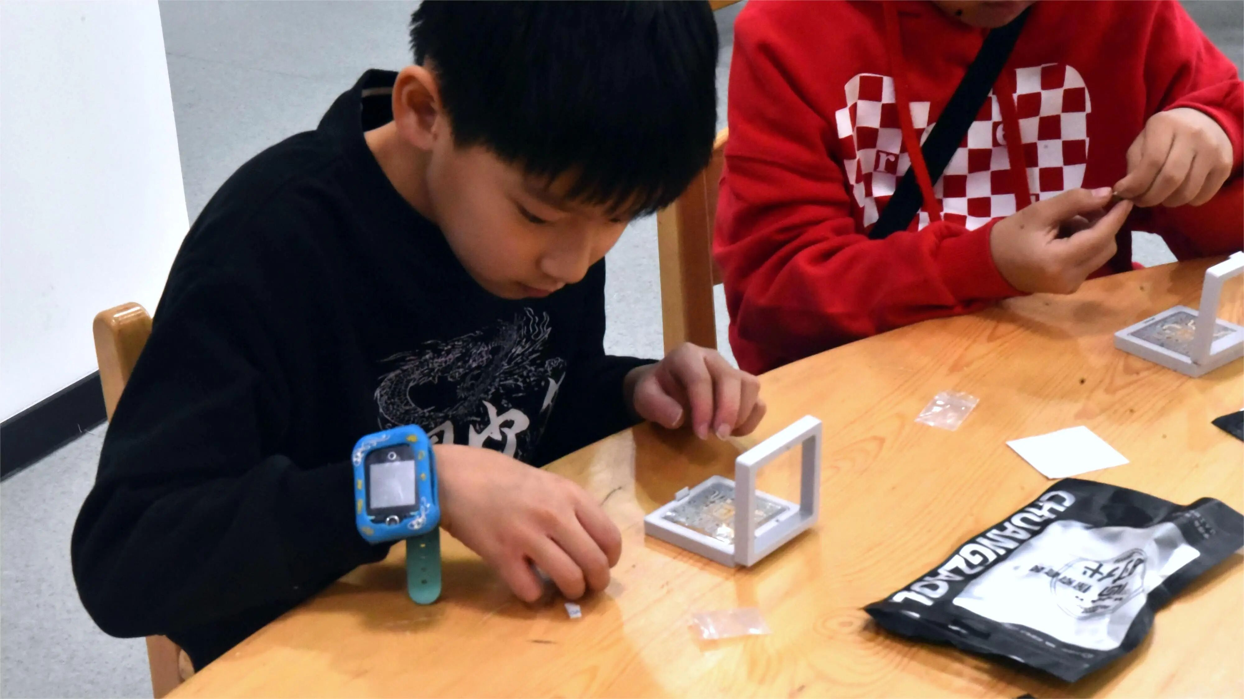 在“我的中国芯”体验课程中,从认识芯片的核心构造、触摸微型电路元件开始,孩子们亲手参与芯片封装的简化实操,不仅能直观感受“一粒芯片藏乾坤”的科技魔力,更能在动手实践中培养逻辑思维与精细操作能力,在心中种下探索半导体世界的好奇种子。
