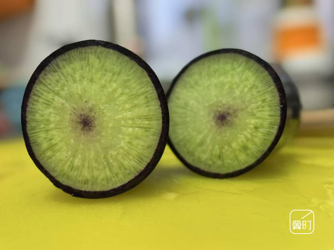 沧州盐山县边务镇星马村的设施大棚内,绿油油的萝卜叶子高过了小腿肚儿,一个个紫红色的萝卜匀称笔直,探出地面。当地引进的果蔬新品种——“冰淇淋”萝卜迎来采收季。