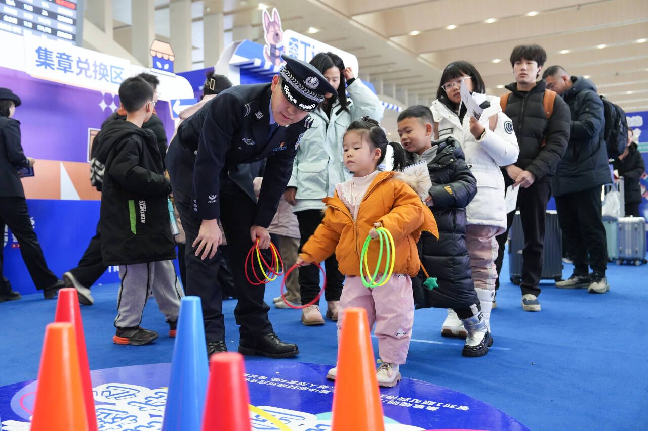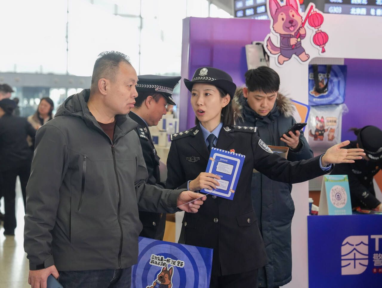 “恭喜您答对了!给您集一个‘送福章’。”“反诈攻坚”区域,民警为带着孩子返乡的王先生盖上印章,他笑着说:“一边玩一边学,孩子也记住了‘不轻信陌生来电’。”旁边的“套圈学安检”区域同样排起小队。旅客李女士成功套中目标后,在民警引导下准确回答出安检注意事项,获得一枚小章。“这种方式轻松易懂,提醒我们出行时注意安全细节。”她说。