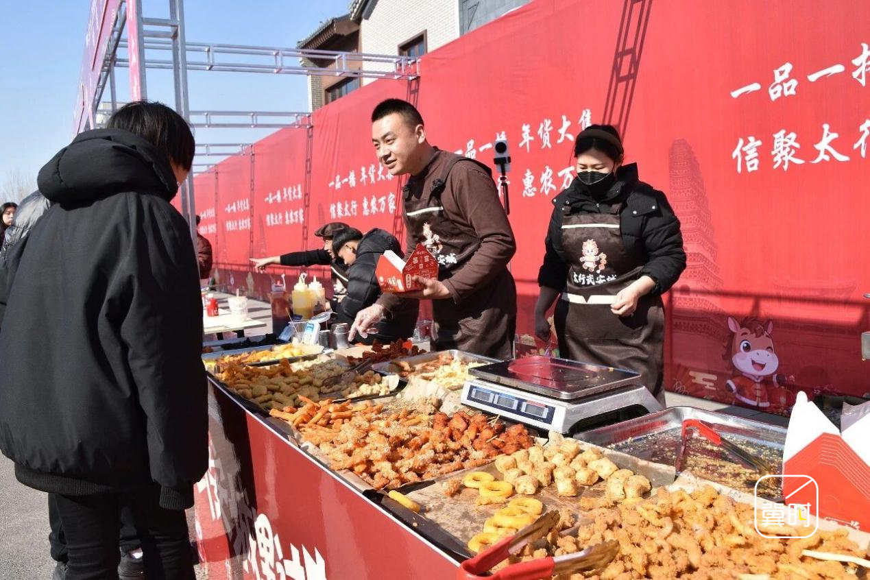 武安市“一品一播”年货大集2月1号正式启幕以来,100多家武安本土商超、餐饮及小商品商家齐聚,锅盔夹肉、驴肉卷饼等特色美食香气四溢,炸撒子、小麻糖等承载武安人记忆的民俗小吃琳琅满目,唤醒市民舌尖上的乡愁。