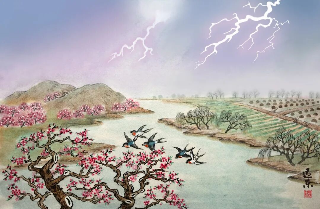 虽然惊蛰始有雷鸣,但是多雨的时节是在春分以后,随着天气转暖,雨水增多,下雨时,天空出现雷声了。