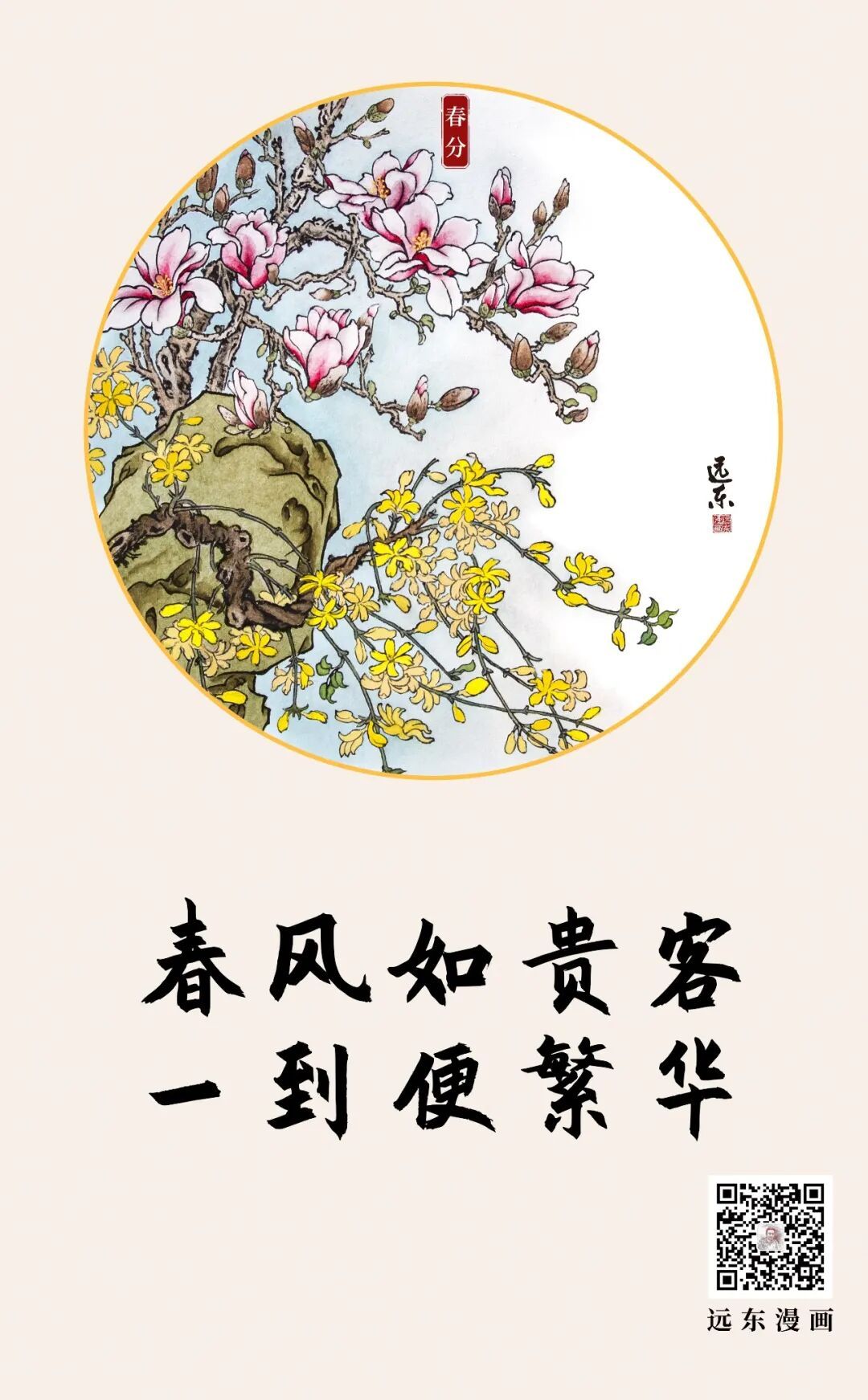 春分,平分春天:“二月中,分者半也,此当九十春日之半,故谓之分”,古人认为,从立春到立夏,春季有90天,到春分节气正好过半,所以谓之为“分”,是春季的中分点。到了春分,无论南方北方,都进入了春意融融、生机盎然的好时节,春风、春雨、春光,所到之处都鲜花盛开,生机勃勃。