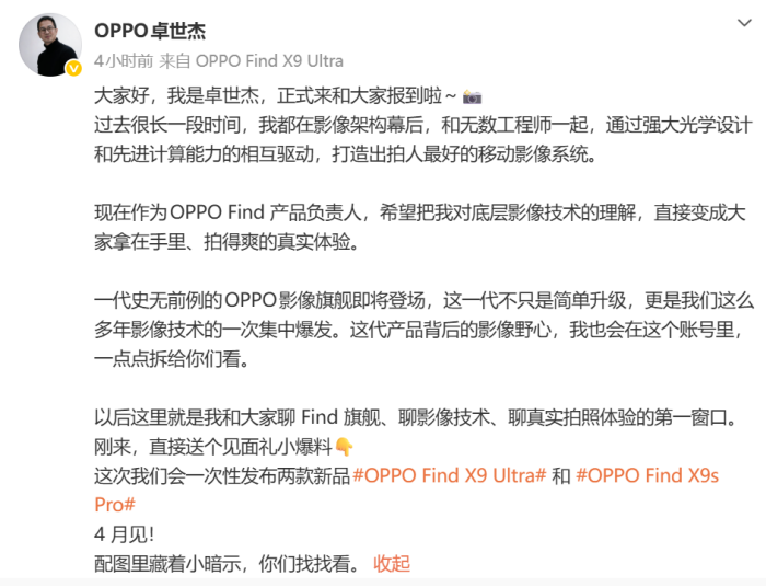 OPPO正式官宣,备受期待的影像旗舰——OPPO Find X9 Ultra,将于4月正式发布。