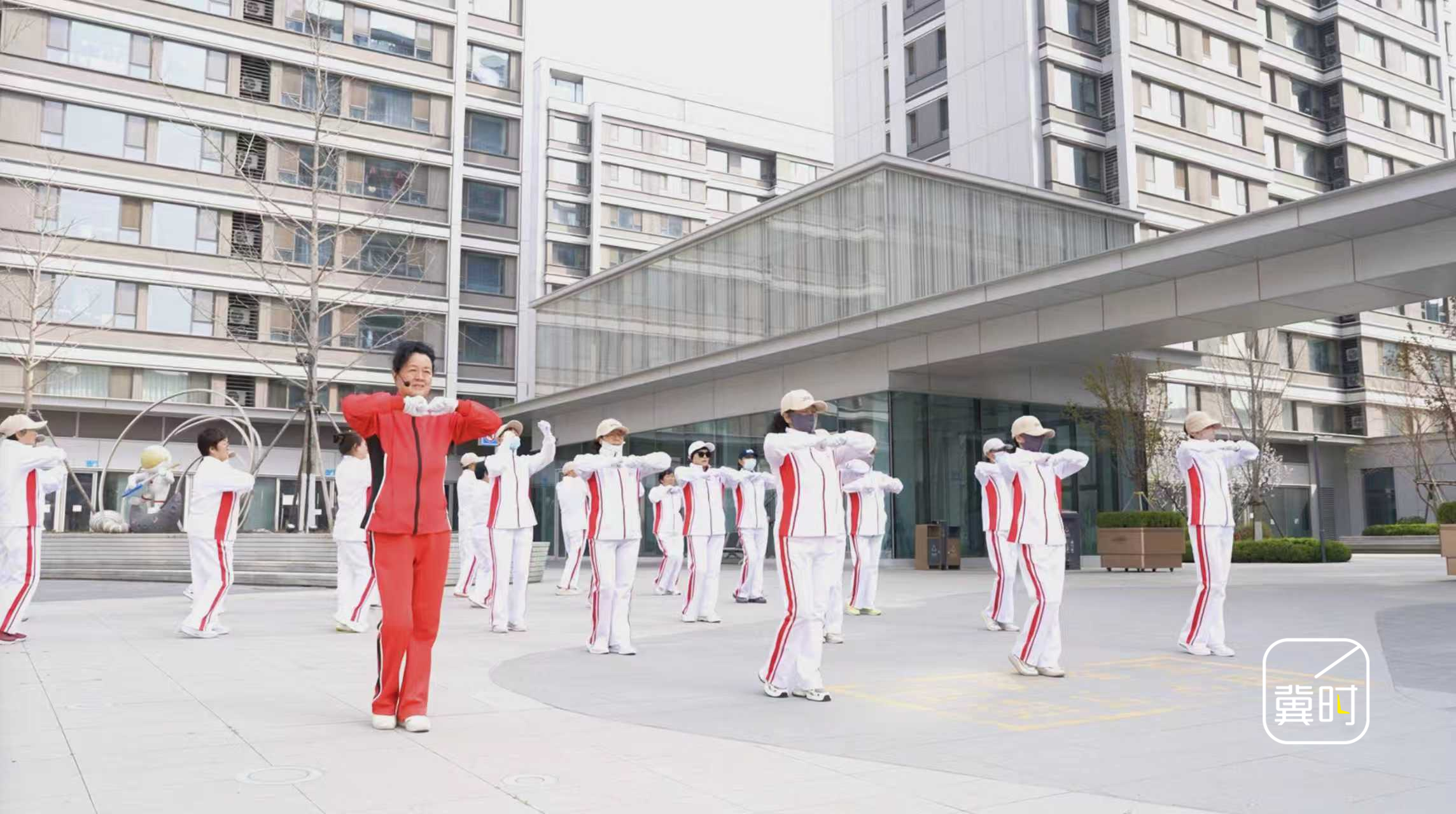 从党群服务中心出来,一阵悠扬的歌声从小区花园传来。记者循声走去,几位阿姨正在锻炼身体,领舞的是王素平。