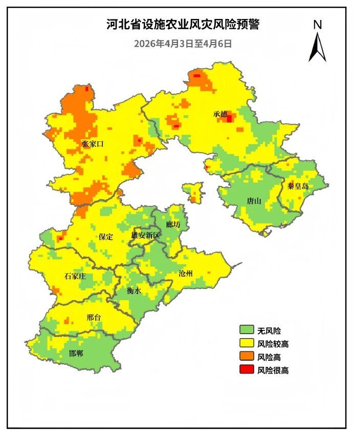 受冷空气和地面气旋共同影响,预计4月3-6日我省自西向东将出现大风降温过程,大部分地区有偏北风4到6级,阵风7到8级,局地可达9级以上,同时全省大部地区伴有扬沙或浮尘天气。受此影响,张家口、承德、秦皇岛、保定、雄安新区、石家庄、邢台七市大部,沧州中东部,唐山、廊坊、衡水、邯郸四市局部等地设施农业风灾风险较高,其中张家口、承德两市局部设施农业风灾风险高。建议各地加强设施生产管理,提前加固设施棚体、压紧压实棚膜,大风时关闭通风口,防范设施结构与棚膜受损,最大程度降低风灾可能带来的影响。