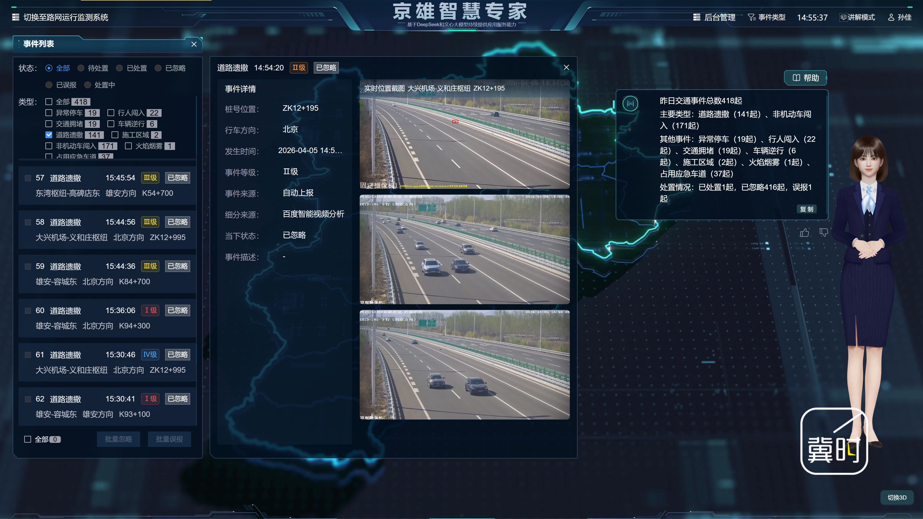 他给记者举了个例子,当传统高速仍在采用人工巡查的时候,京雄高速已经深度融合了“DeepSeek+百度文心”双引擎大模型,实现了对异常停车、占用应急车道、道路遗撒等十余类突发状况的动态监测。另外,大模型技术还提升了施工区域监管、交通事故检测等场景的精准度与实效性,增强了高速安全防控和主动预警能力。
