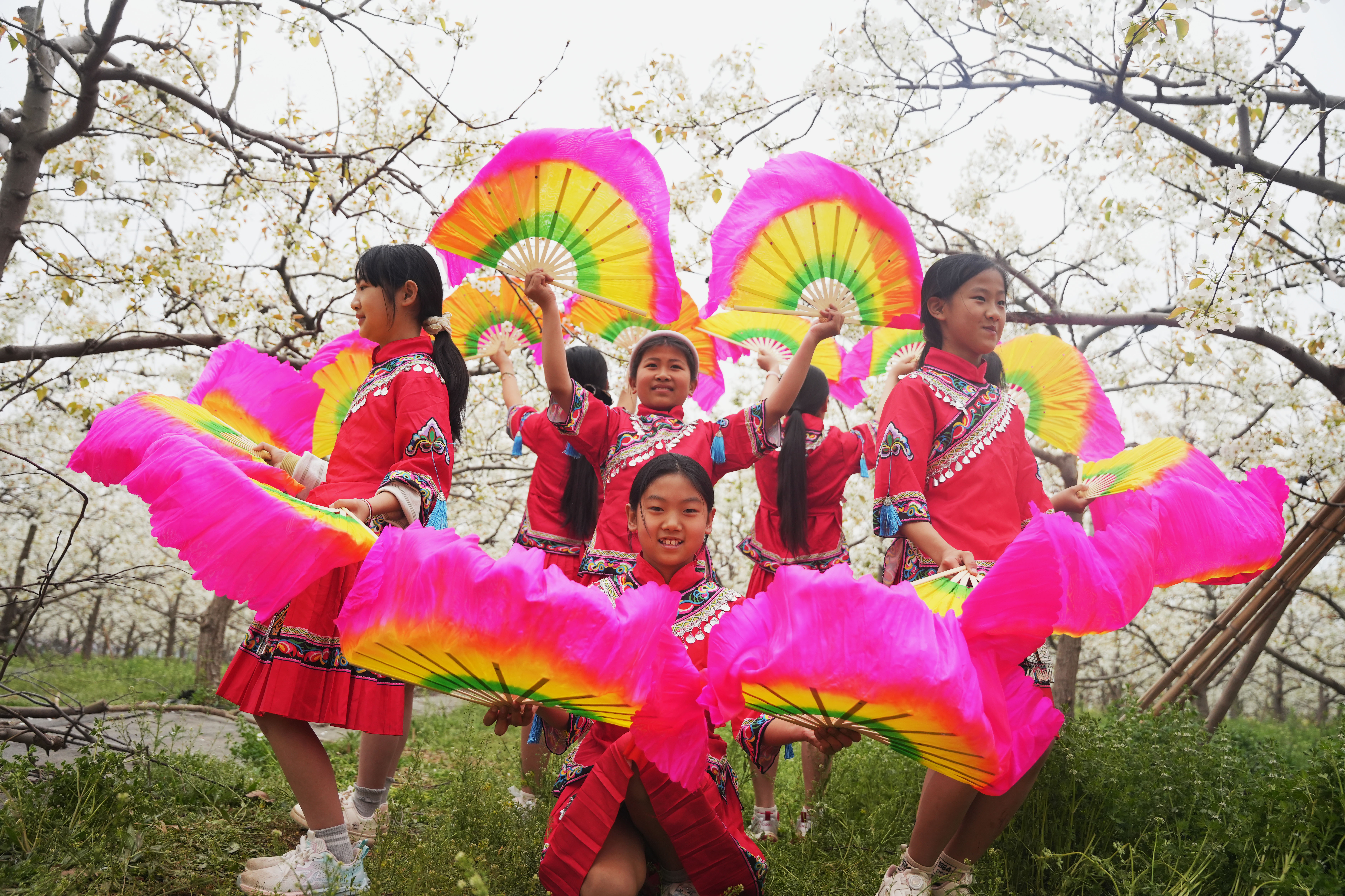 4月8日,邢台隆尧县牛家桥乡北杨家楼村香梨基地,牛家桥小学的师生踏青赏花、作画写生、习武健身,洁白的梨花,学生们娇艳的服装和剪影,构成一幅幅美丽的图画。