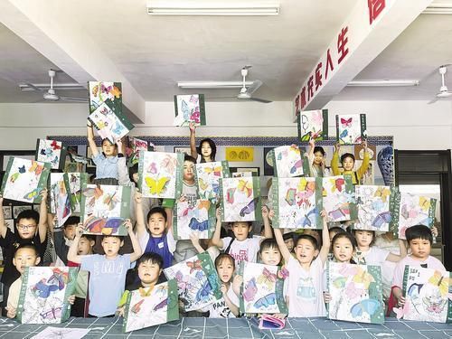 7月26日,新乐市东阳学校乡村学校少年宫开展暑期绘画公益性课程。图为参与课程的孩子们展示在课堂上画的蝴蝶。