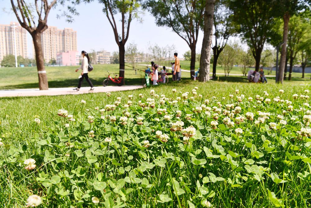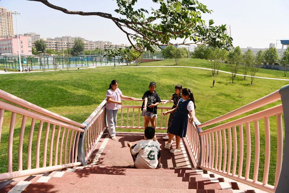↑5月26日,市民在河北省石家庄市栾城区一处“口袋公园”游玩。